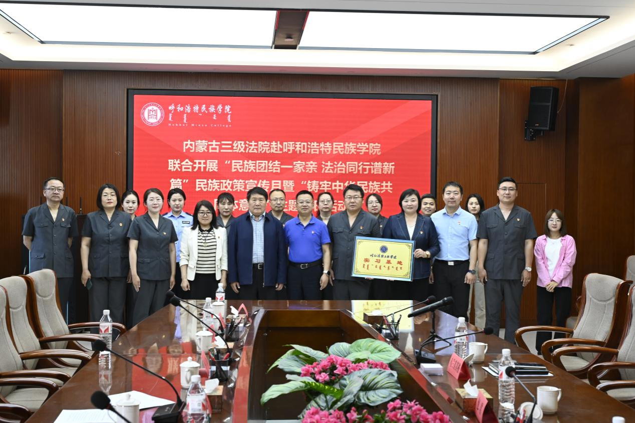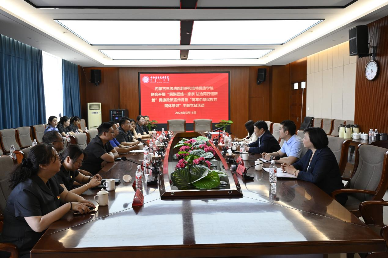 5月16日下午,时值“民族政策宣传月”,又逢“民族法制宣传周”到来之际,beat365官网联合自治区三级法院以铸牢中华民族共同体意识为主线,共同开展“民族团结一家亲 法治同行谱新篇”民族政策宣传月暨“铸牢中华民族共同体意识”主题党日活动。自治区高级人民法院立案庭庭长刘洪舫,呼市中级人民法院政治部副主任于宏,新城区人民法院院长赵俊平等一行35人,beat365官网党委委员、统战部部长包君,党委委员、组织部部长吴阿古拉,法学院领导班子成员参加了活动。