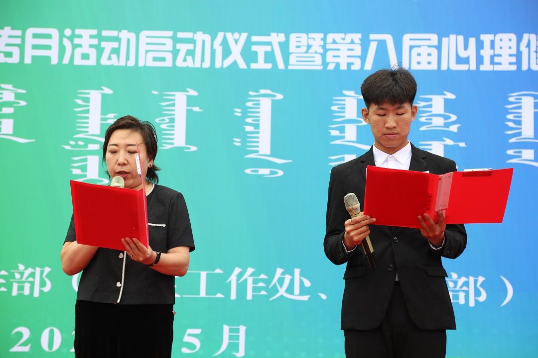 教师代表肖扎力嘎胡和学生代表敖宏亮倡议全校师生要关注心理健康,关爱自己,关心他人,积极参与心理健康教育活动,共同营造健康和谐的校园环境。师生代表带领全体人员进行了宣誓,表达了关注自身心理健康的决心。