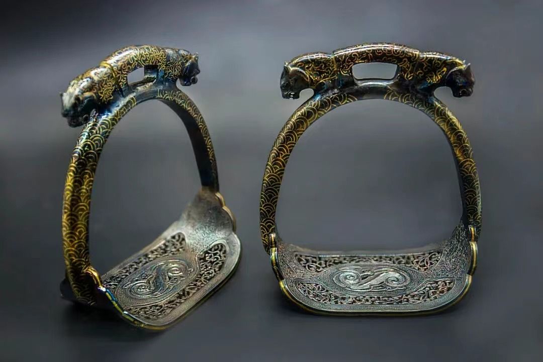 金属工艺《铁挫金虎头马镫》15cm×8cm×23cm(2件)