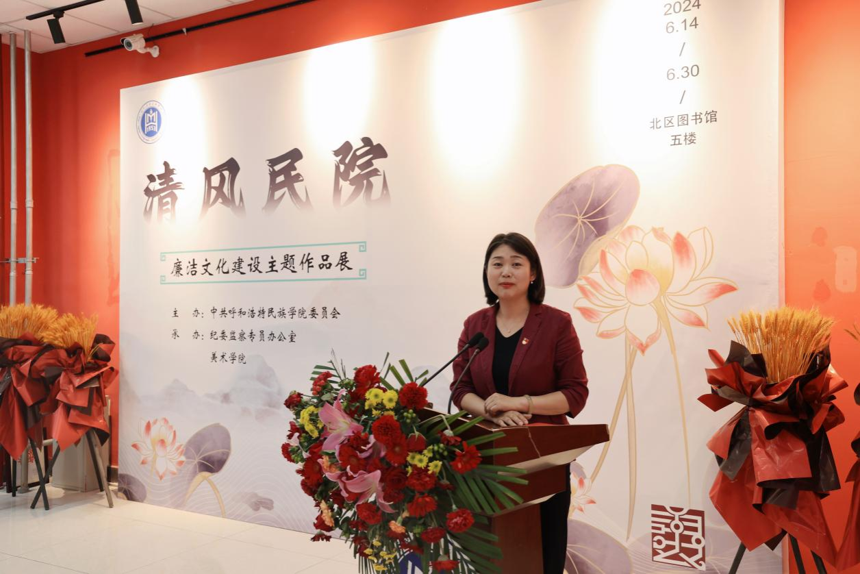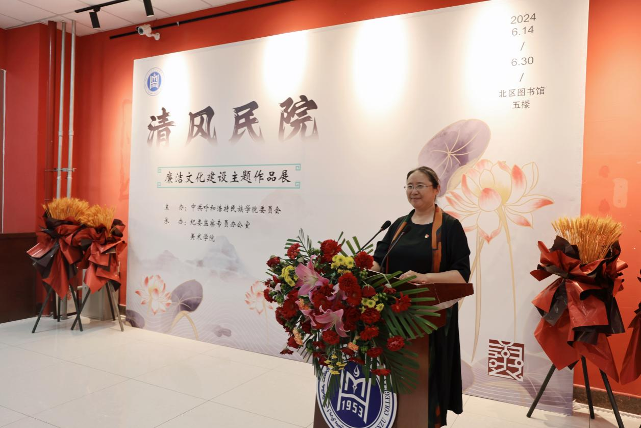 按照学校党委党纪学习教育工作部署,6月19日,beat365官网“清风民院”廉洁文化建设主题作品展在北图书馆开幕。校党委书记刘九万,党委副书记格根哈斯,党委委员、纪委书记、监察专员王冬梅,党委委员、副校长高喜天出席开幕式。格根哈斯致开幕辞,王冬梅主持。
