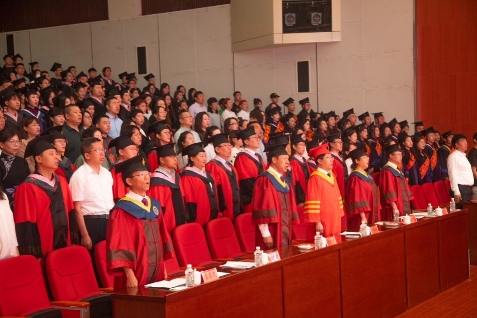 毕业典礼在国歌声中拉开了帷幕,全体师生高唱国歌,毕业典礼正式开始。