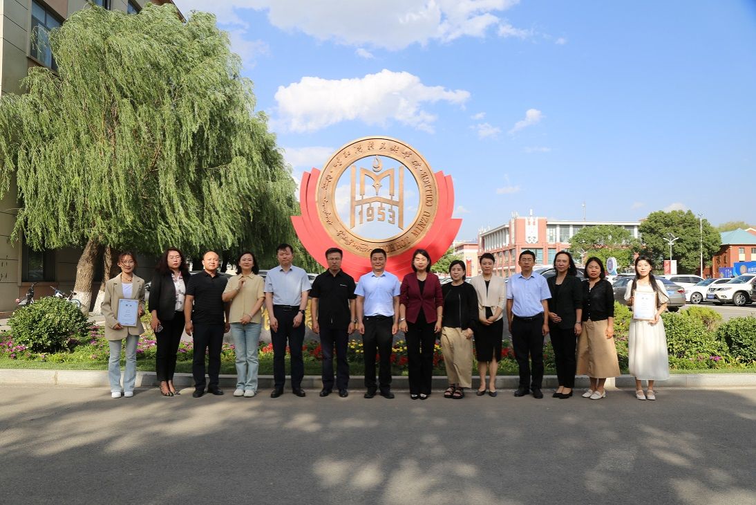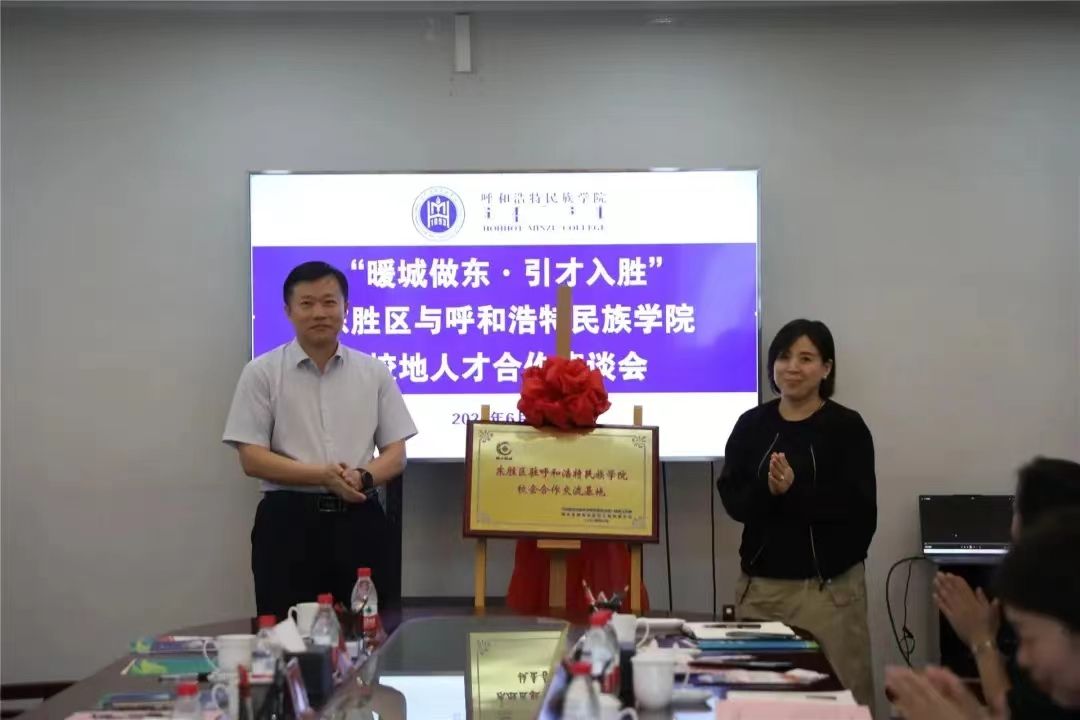 东胜区委常委、统战部部长边杰与学校教务处处长肖查娜为“东胜区驻beat365英国官方网站校企合作交流基地”揭牌。