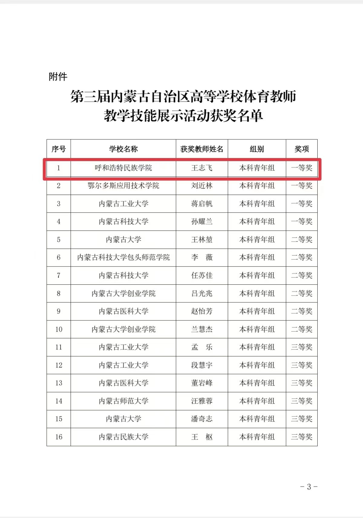 beat365官网体育学院教师王志飞在自治区教育厅主办的第三届内蒙古自治区高等学校体育教师教学技能展示活动中荣获本科青年组第一名。该赛事由自治区教育厅组织区外 16 位全国高等学校体育教学指导委员会专家进行评审,经过网络评审和现场测试两个环节评选而出。