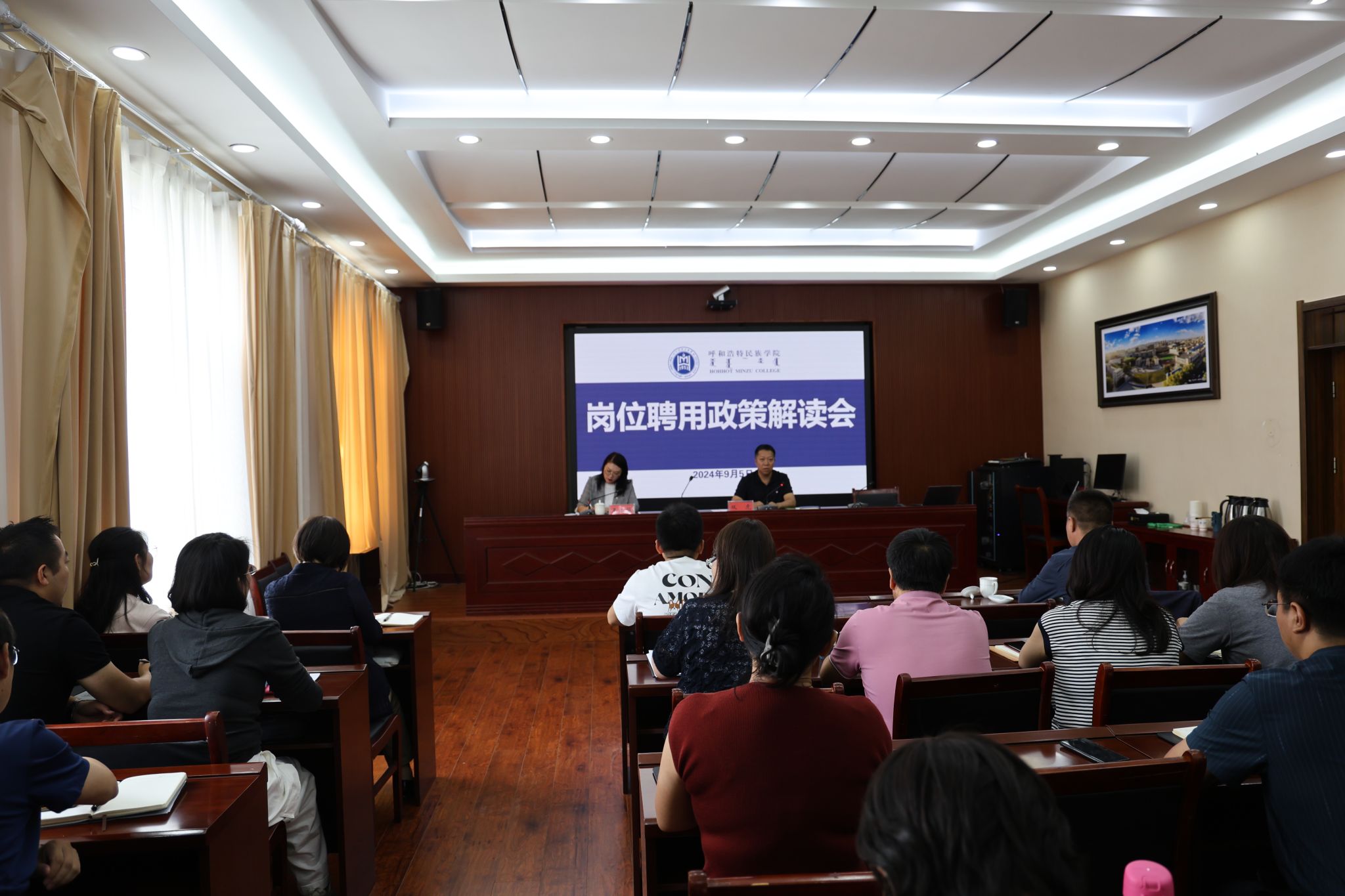 9月5日,学校在办公楼四楼会议室召开岗位聘用工作政策解读会,并布置近期学校人事相关工作。校党委委员、副校长双虎出席会议,各学院、部门负责人及工作人员参加会议。人事处处长王小梅主持会议。