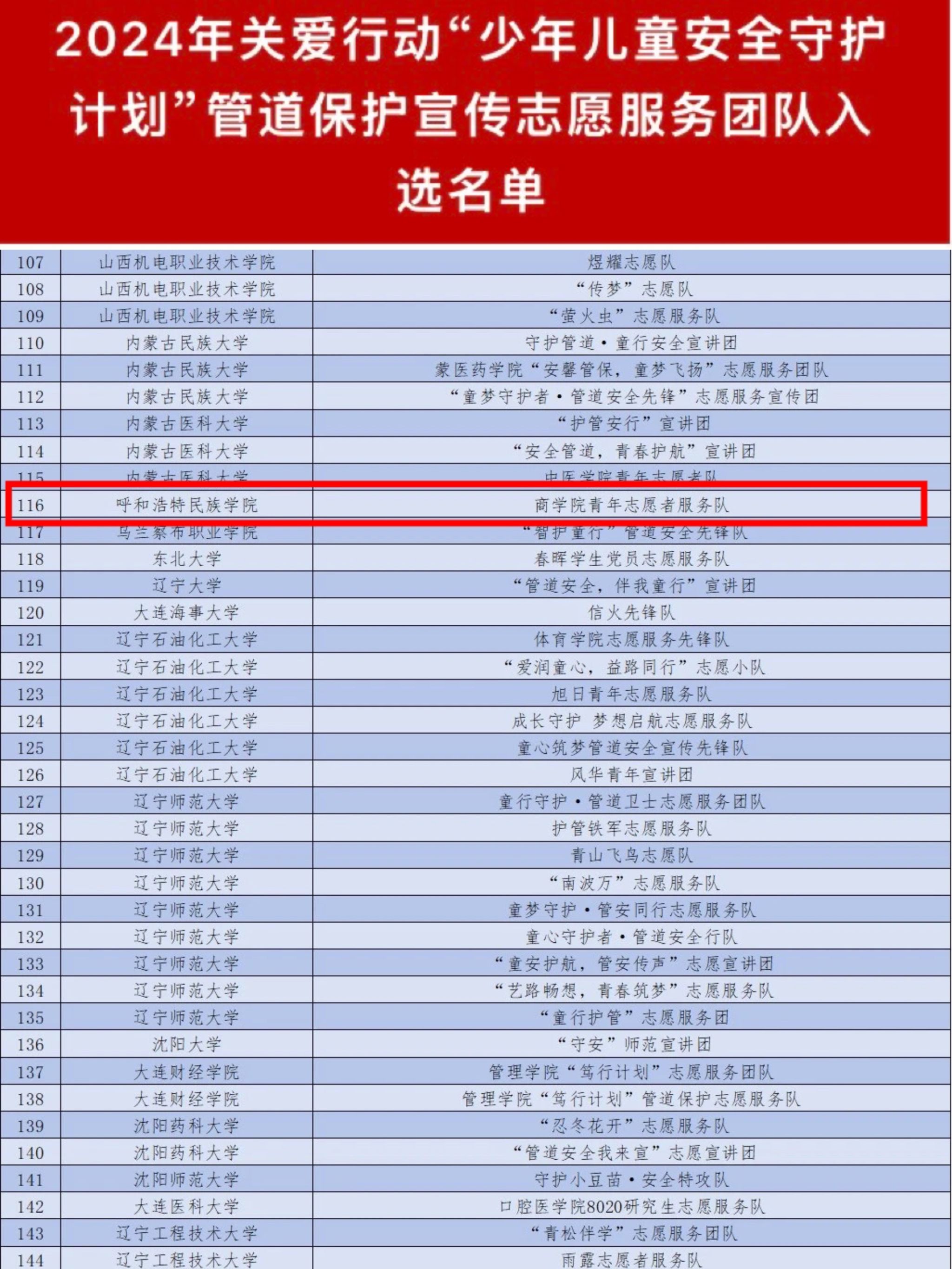 近日,团中央青年志愿者行动指导中心、中国少年儿童新闻出版总社有限公司联合国家石油天然气管网集团有限公司共同发布了《关于遴选2024年关爱行动“少年儿童安全守护计划”管道保护宣传志愿服务团队的公告》。beat365官网商学院青年志愿者服务队等419所高校1000支志愿服务团队入选。