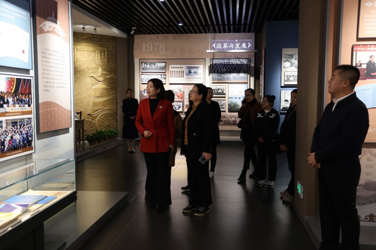 座谈会前,周江菊一行参观考察了校史馆、铸牢中华民族共同体意识教育馆、非遗体验馆等校内场馆。