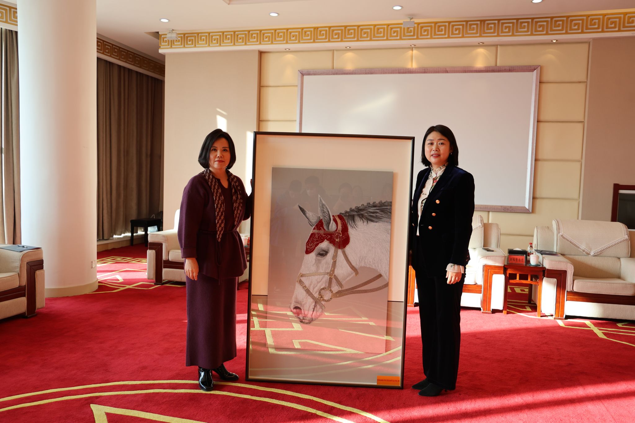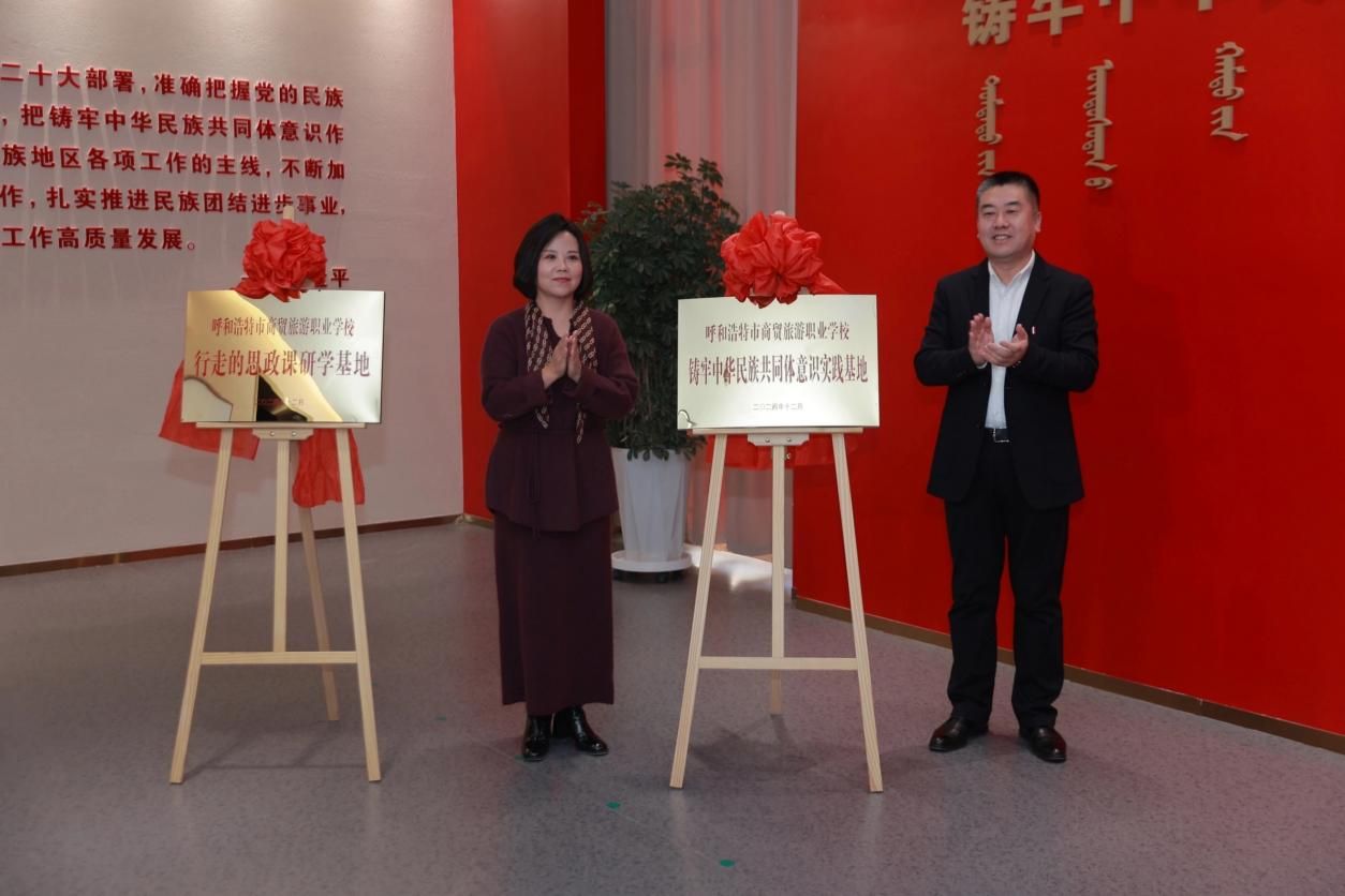 张霄云与朝格吉乐图为“呼和浩特市商贸旅游职业学校铸牢中华民族共同体意识实践基地”“呼和浩特市商贸旅游职业学校行走的思政课研学基地”进行揭牌,并在“北疆小红马”大学生宣讲员的讲解下参观了学校铸牢中华民族共同体意识教育馆。今后,两校将充分利用学校铸牢中华民族共同体意识教育馆的展陈资源,广泛开展宣传教育活动,不断构筑中华民族共有精神家园。