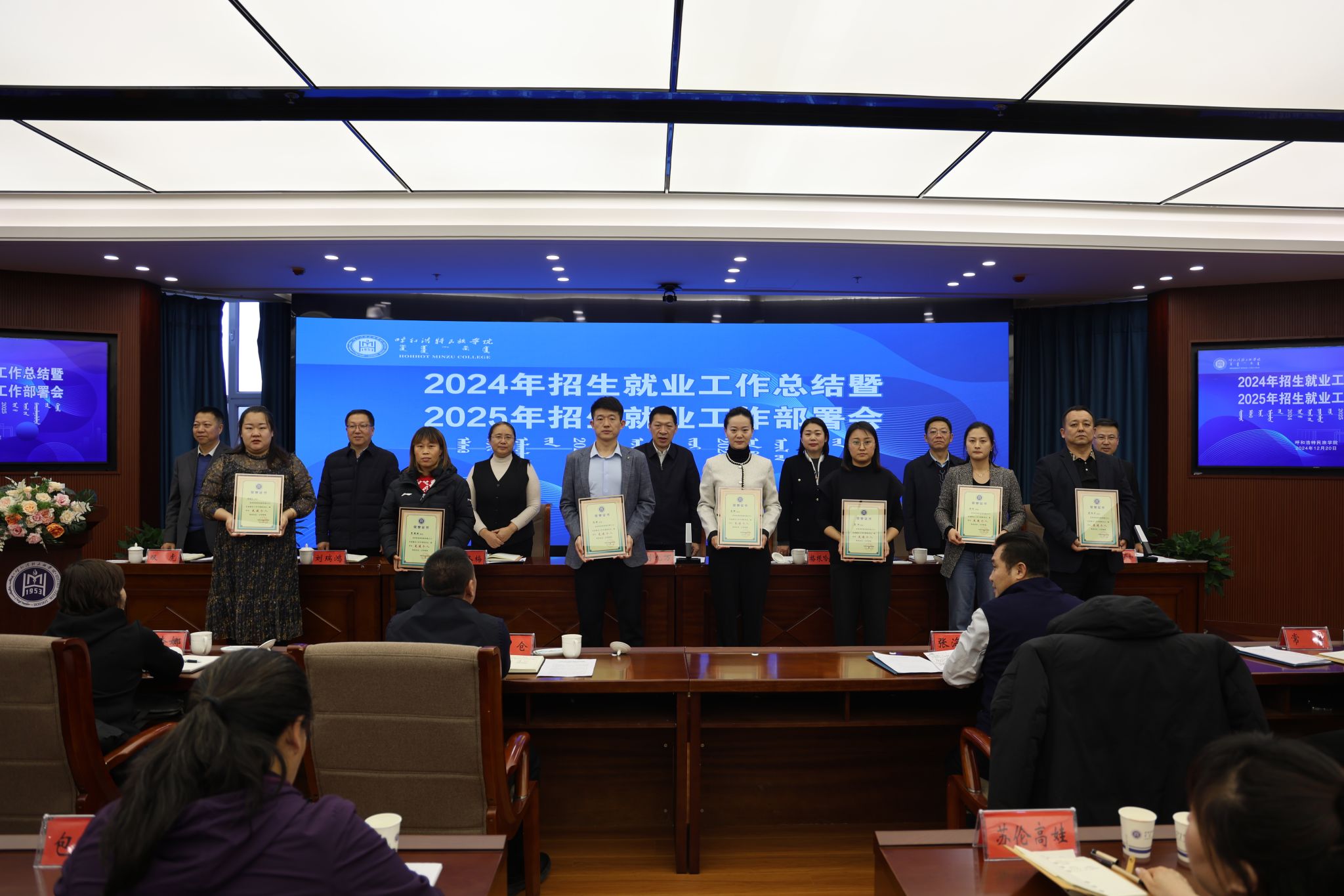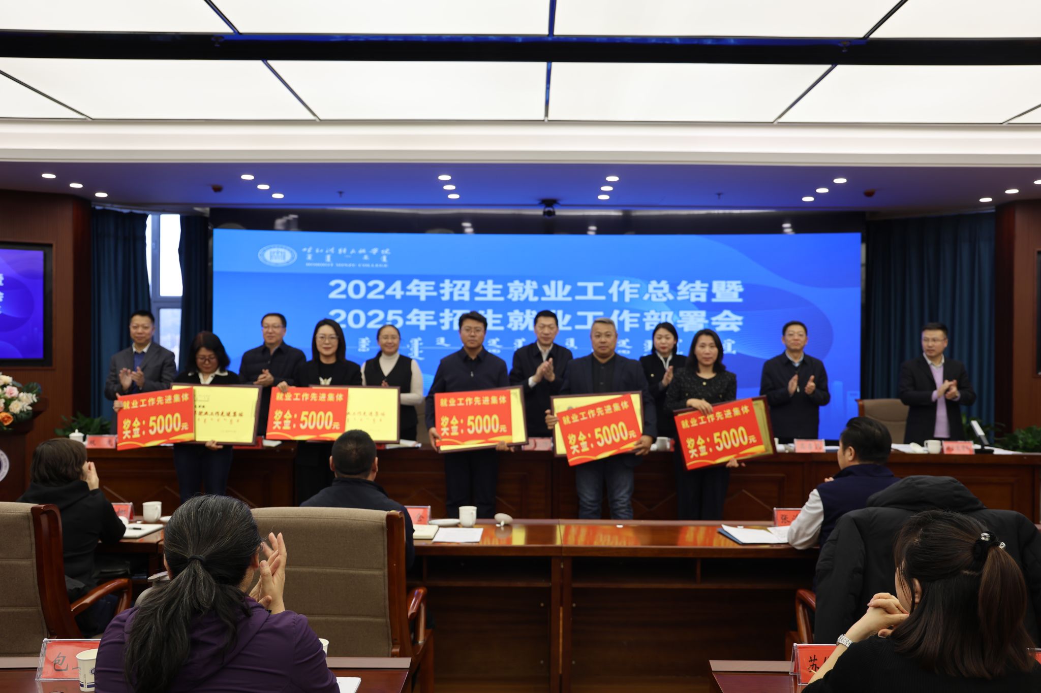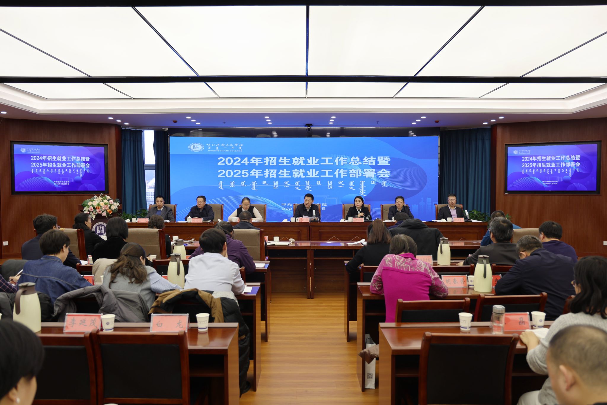 12月20日,学校在综合楼12楼会议室召开了2024年招生就业工作总结暨 2025年招生就业工作部署会议。校党委书记刘九万出席会议并讲话。党委副书记格根哈斯,党委委员、纪委书记、监察专员王冬梅,党委委员、副校长高喜天,党委委员、副校长刘瑞鸿,党委委员、副校长额尔敦布和,党委委员、副校长双虎出席会议。会议由额尔敦布和主持。