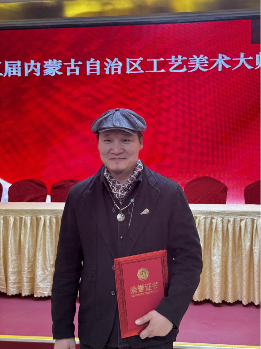 敖日格勒:中国民间文艺家协会会员。内蒙古民间文艺家协会理事。内蒙古工艺美术协会理事。自治区工艺美术大师、在读博士、非物质文化传承人。其作品曾获得全国银奖一次、铜奖一次,自治区级金奖4次、银奖4次。2023年获得第十三届萨日纳奖。