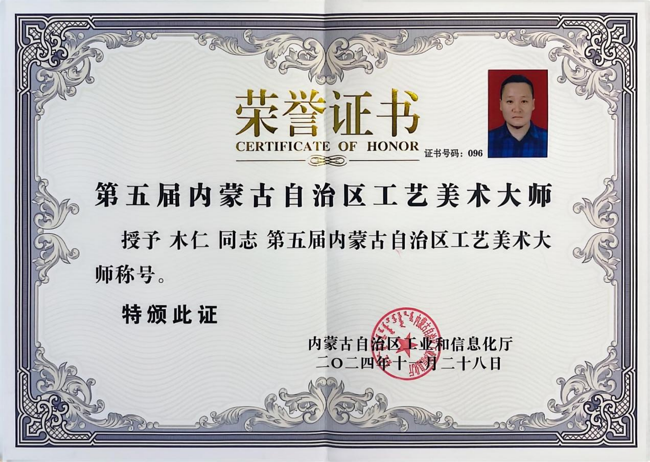 木仁:内蒙古民间文艺家协会会员,内蒙古工艺美术协会常务理事,内蒙古自治区工艺美术大师。省(区)级马鞍制作技艺代表性传承人。市级马鞍制作技艺非遗工坊负责人。自治区级创新工作室带头人。其作品曾获得全国铜奖一次、优秀奖一次、入围一次,自治区级金奖4次、银奖8次、特邀奖一次。主持省级课题2项。
