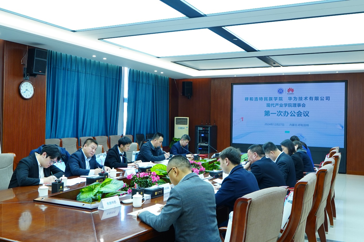 仪式结束后,举办了华为现代产业学院理事会第一次办公会议。由理事长额尔敦布和作关于现代产业学院章程起草的说明,理事会全体成员审议章程并表决通过。执行院长包乌格德勒详细介绍了产业学院的发展规划,与会人员围绕发展规划展开深度研讨。