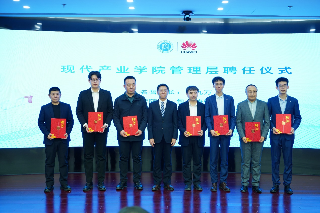期间,进行了华为现代产业学院管理层聘任仪式。刘九万任名誉院长。高喜天为管理层相关人员颁发聘书。包乌格德勒任执行院长,色登丹巴、于海奇、郝鑫宇任副院长,杨恒毅、郭富、任杰任办公室成员。