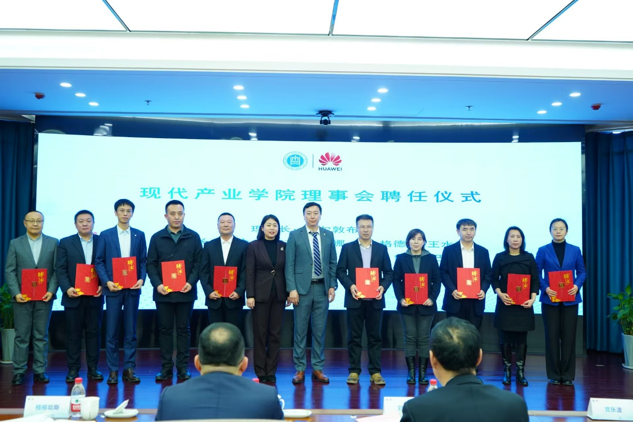 期间,进行华为现代产业学院理事会聘任仪式,由格根哈斯、党张波为理事会成员颁发聘书。额尔敦布和任理事长,包仓、王传杰、肖查娜、包乌格德勒、王水英任副理事长,郝鑫宇、于海奇、齐瑞、杜凤懿、色登丹巴任理事。