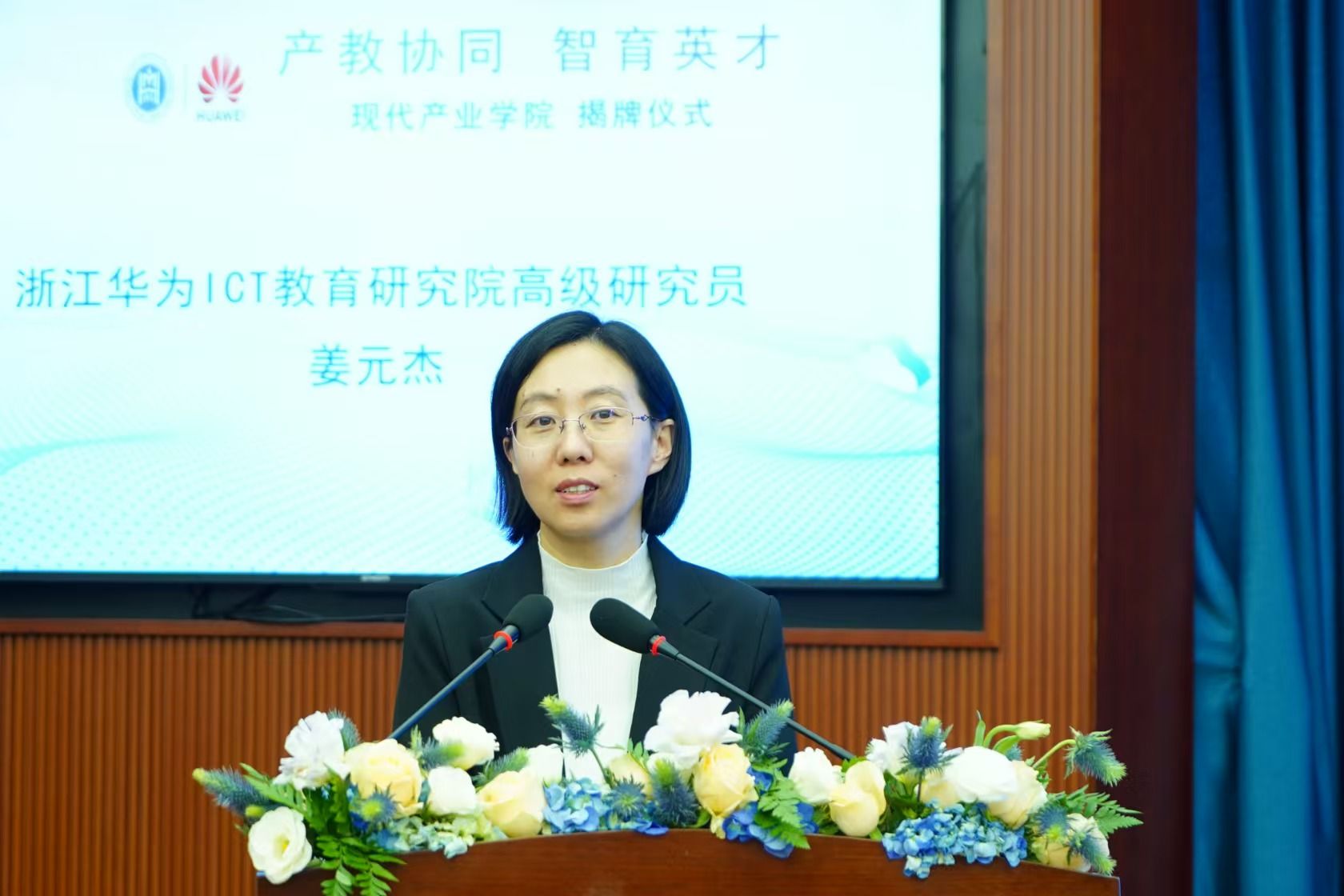 同期,进行了现代产业学院专家论坛,浙江华为 ICT 教育研究院高级研究员姜元杰以“华为数智人才培养实践分享”为主题做了专题讲座。