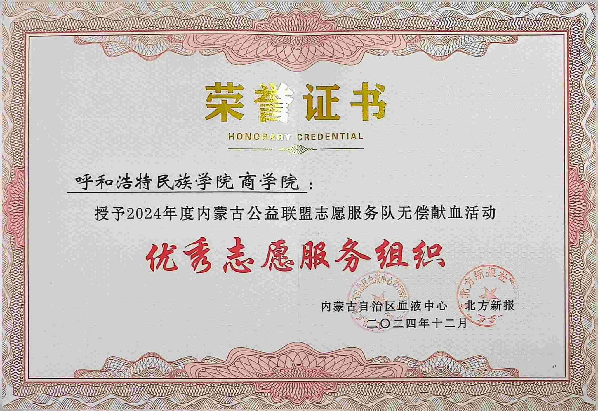 近日,商学院志愿服务队、指导教师华国庆在2024年度内蒙古公益联盟志愿服务队无偿献血活动中表现优异,荣获“优秀志愿服务组织”及“优秀志愿服务工作者”称号。