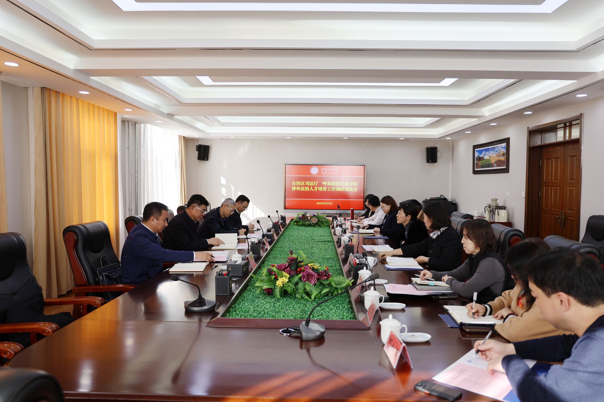 为进一步做好法治人才培养工作,加强法治建设,3月12日,自治区党委依法治区办副主任、司法厅党委书记、厅长白永平,自治区司法厅党委委员、副厅长张生,司法厅相关处室负责人一行来beat365官网开展专题调研。会前,校党委书记刘九万会见了白永平一行。党委副书记、校长王敏,党委副书记格根哈斯与白永平一行座谈交流。