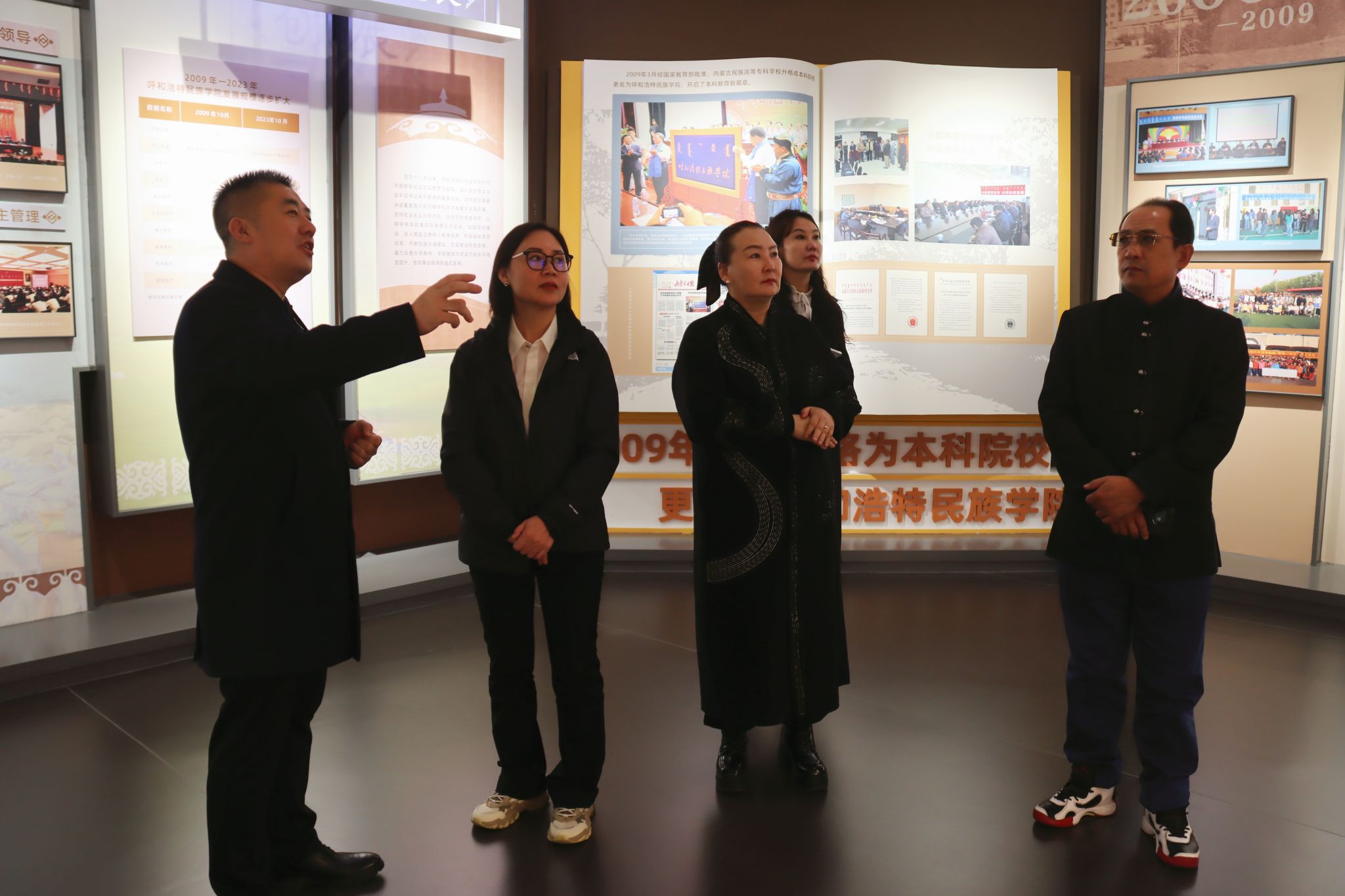 3月18日,苏尼特左旗委常委、宣传部部长姚迪一行4人来beat365官网考察调研。调研组在校党委委员、统战部部长朝格吉乐图陪同下先后参观了校史馆、铸牢中华民族共同体意识教育馆、非遗体验馆等场馆。