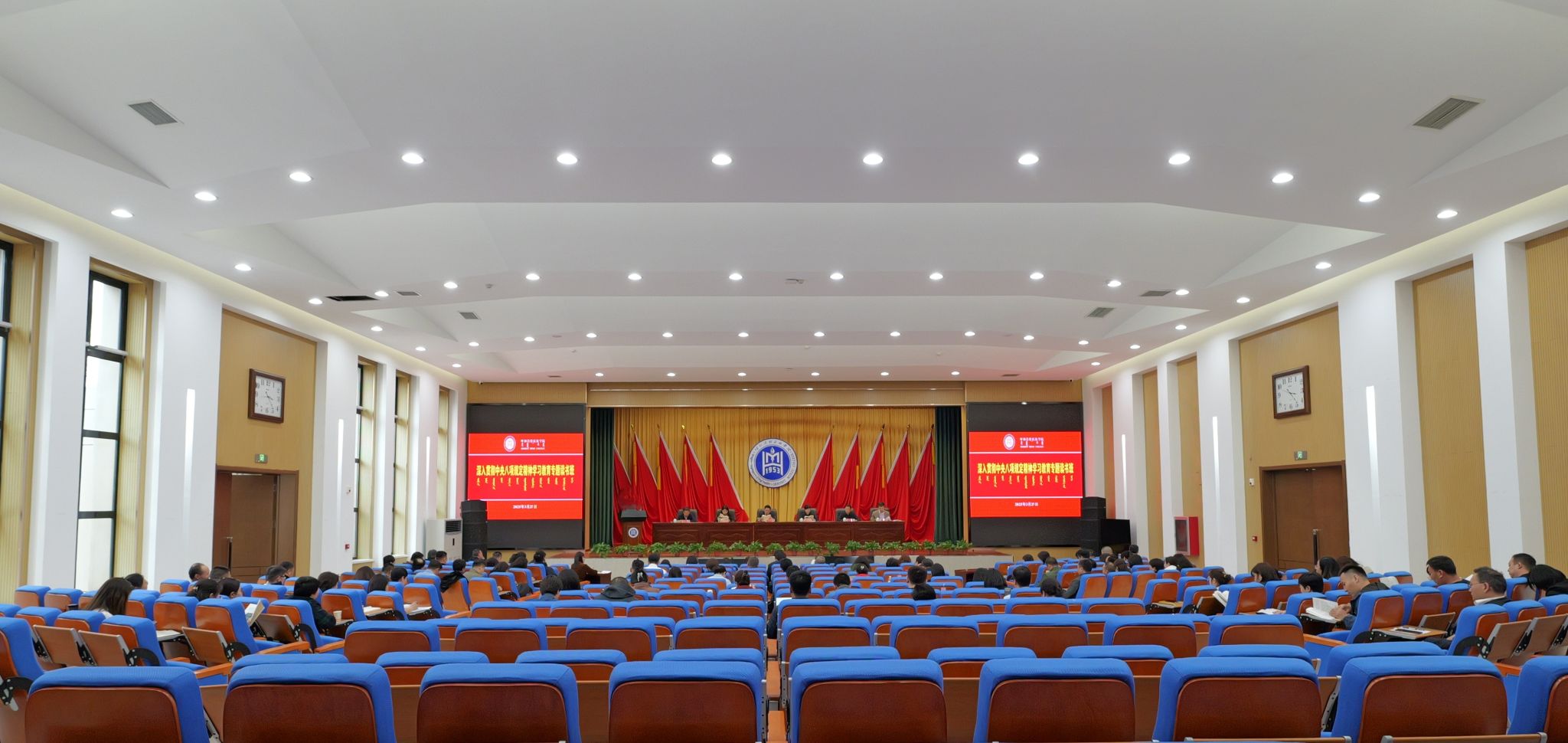 3月26日—27日,学校党委举办深入贯彻中央八项规定精神学习教育读书班。校党委书记刘九万作读书班开班动员讲话,并以党委理论学习中心组(扩大)学习形式讲授了专题党课。校党委副书记、校长王敏作读书班结班讲话。校党委副书记格根哈斯主持。校党委委员、纪委书记、监察专员王冬梅以“八项规定 改变中国”为题作了专题纪律党课。全体校领导、处级干部、党支部书记、教研室主任参加。
