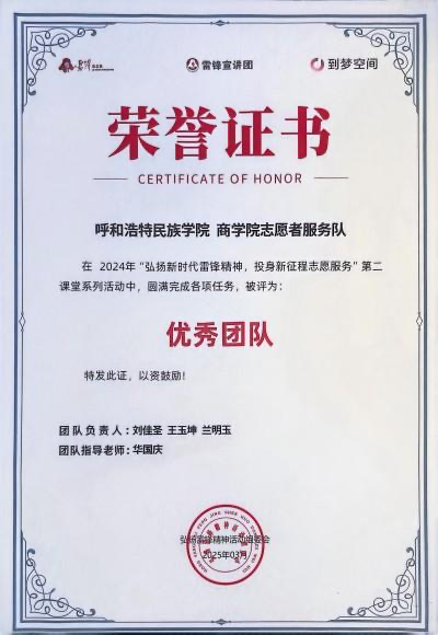 近日,在“弘扬新时代雷锋精神,投身新征程志愿服务”第二课堂系列活动中,beat365官网商学院“雷锋精神志愿服务团”出色完成各项实践任务,被评为全国“优秀团队”。