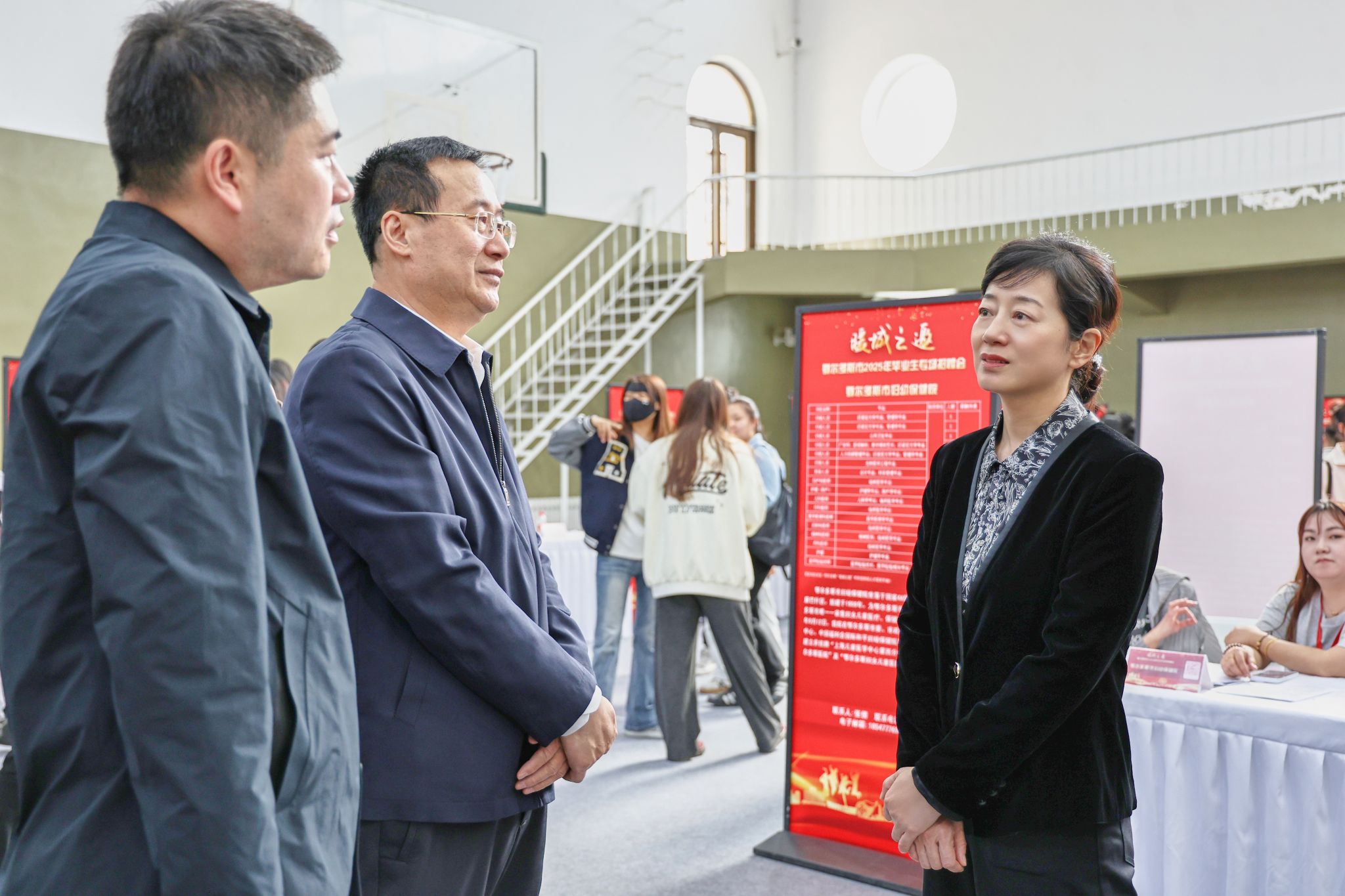 鄂尔多斯市人力资源和社会保障局党组书记、局长张良率政企代表来校引才,鄂尔多斯市人民政府副秘书长杨继强、鄂尔多斯市人社局副局长孟德志及重点企业代表共同参与。校党委书记刘九万,党委副书记、校长王敏等校领导深入招聘会现场调研岗位需求,与毕业生交流求职进展。