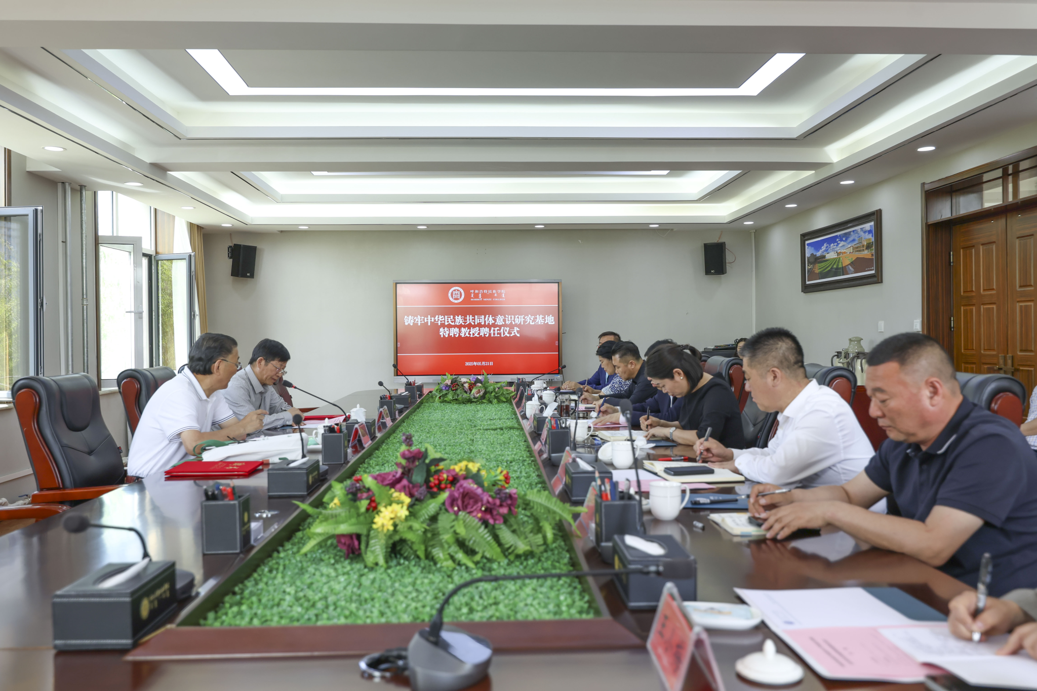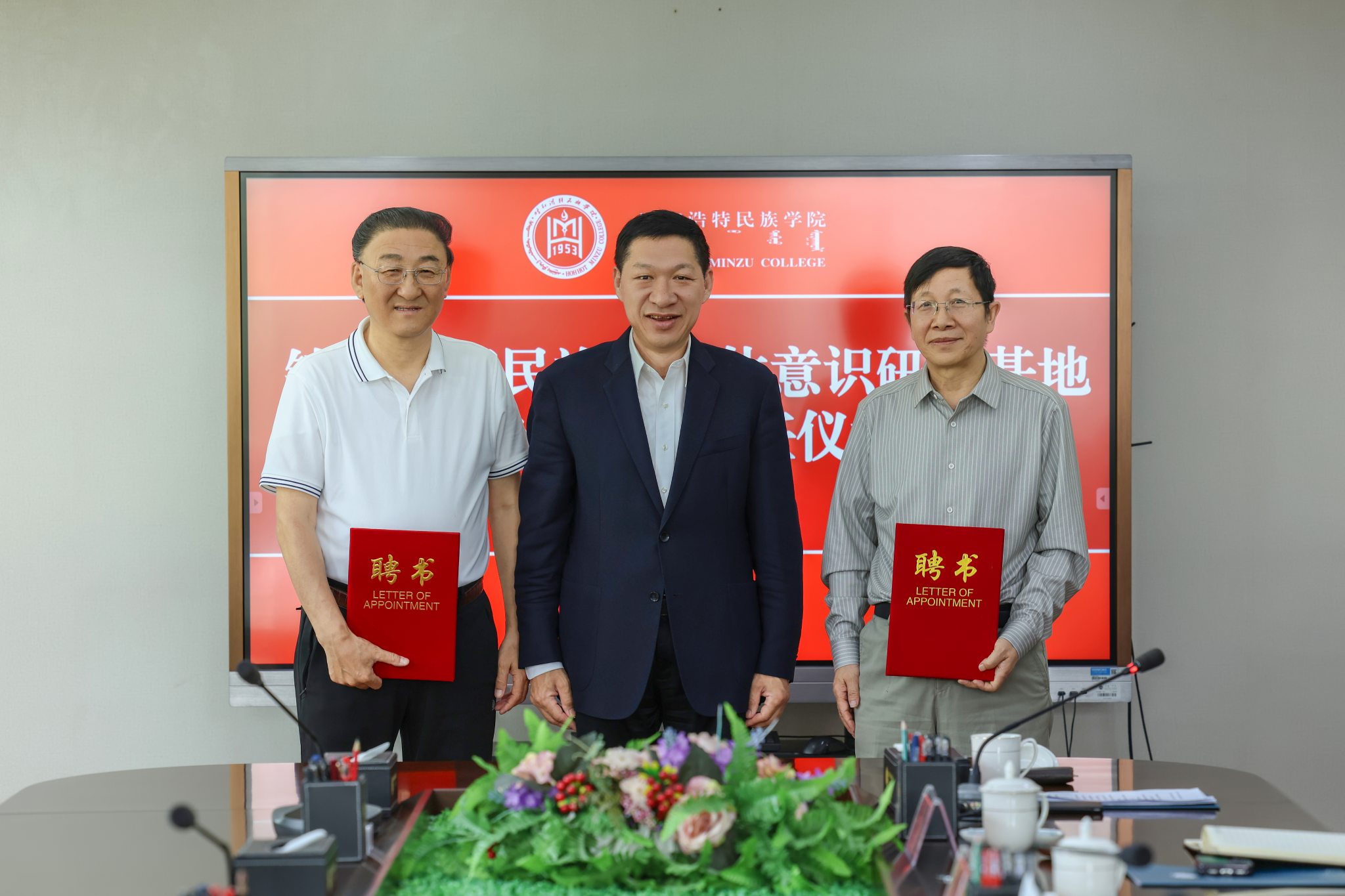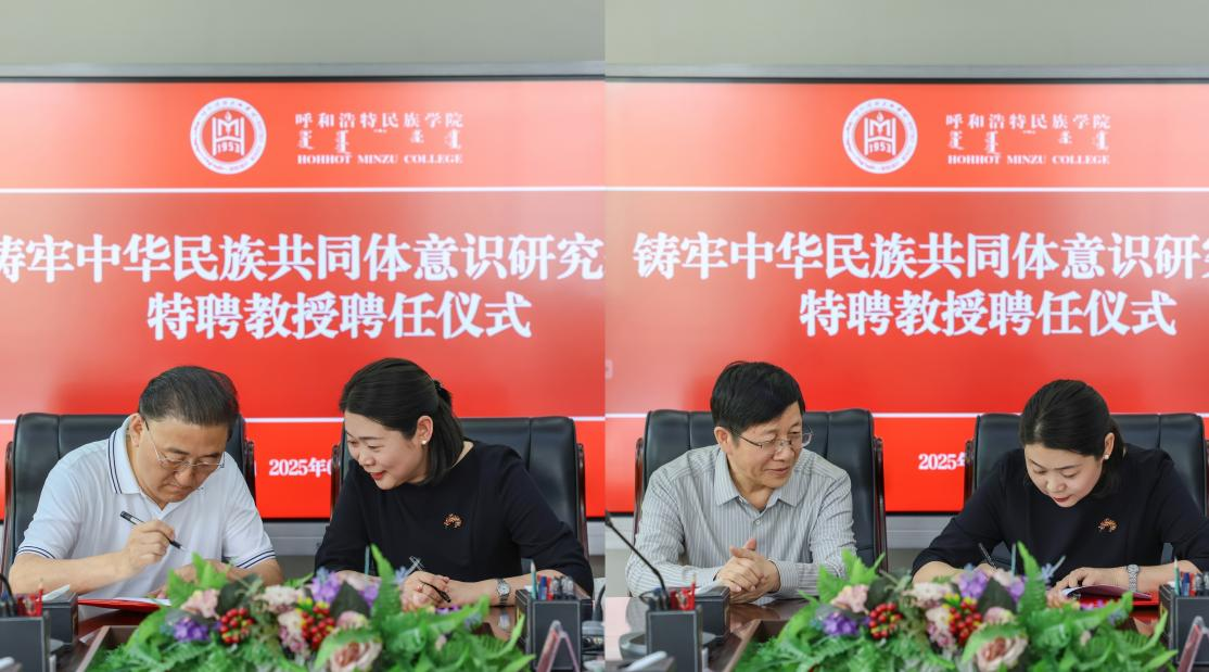 5月21日,beat365官网举行铸牢中华民族共同体意识研究基地特聘教授聘任仪式,聘请中央民族大学二级教授苏德毕力格和内蒙古北宸智库研究中心理事长蔡常青研究员为研究基地特聘教授。校党委书记刘九万、党委副书记格根哈斯出席聘任仪式,学校党政办公室、宣传部、统战部、教师工作部、科研处等相关部门负责人参加仪式。仪式由民族学学院(铸牢中华民族共同体意识研究院)院长青斯琴主持。