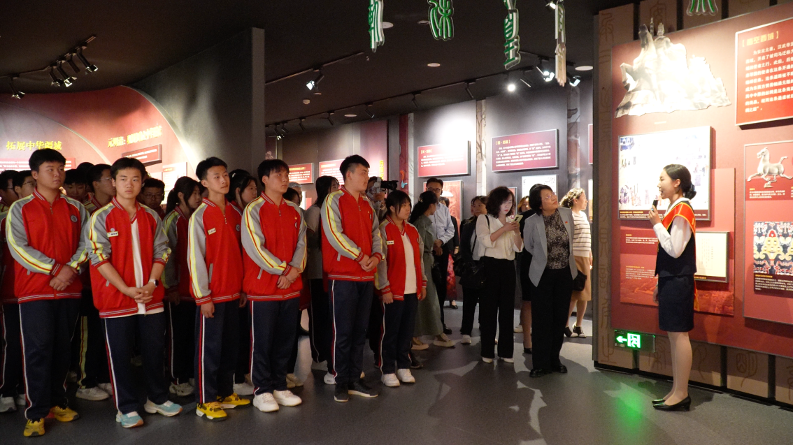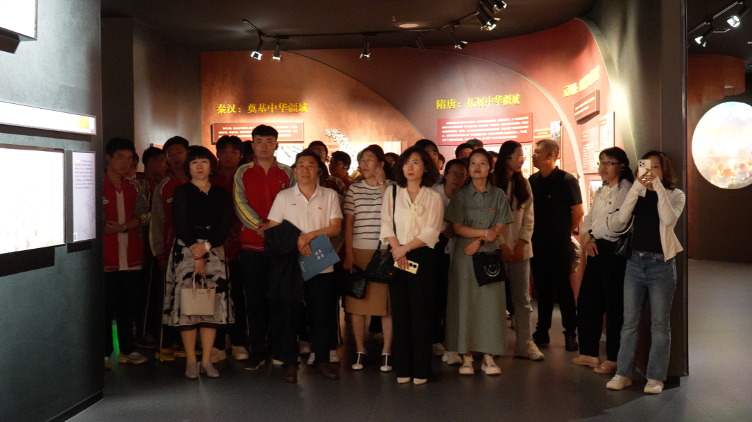 座谈会后,呼和浩特市智能技术应用学校师生在铸牢中华民族共同体意识教育馆进行“行走的思政课”实践教学。两校思政课教师依托教育馆丰富的展陈资源,现场切磋交流思政课教学方法。全体师生跟随讲解员走过“我们从哪里来”、“我们是谁”、“我们要到哪里去”等三部分主题展厅,通过图文展板,数字演示和现场互动体验,有形有感有效铸牢中华民族共同体意识。
