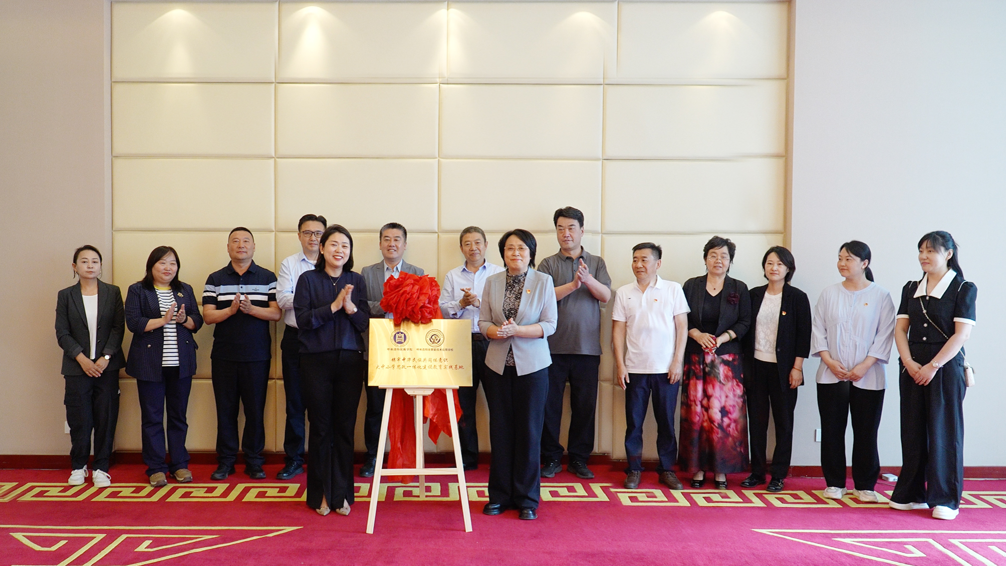 格根哈斯与程莉莉代表双方单位共同为两校“铸牢中华民族共同体意识大中小学思政教育一体化实践基地”揭牌。