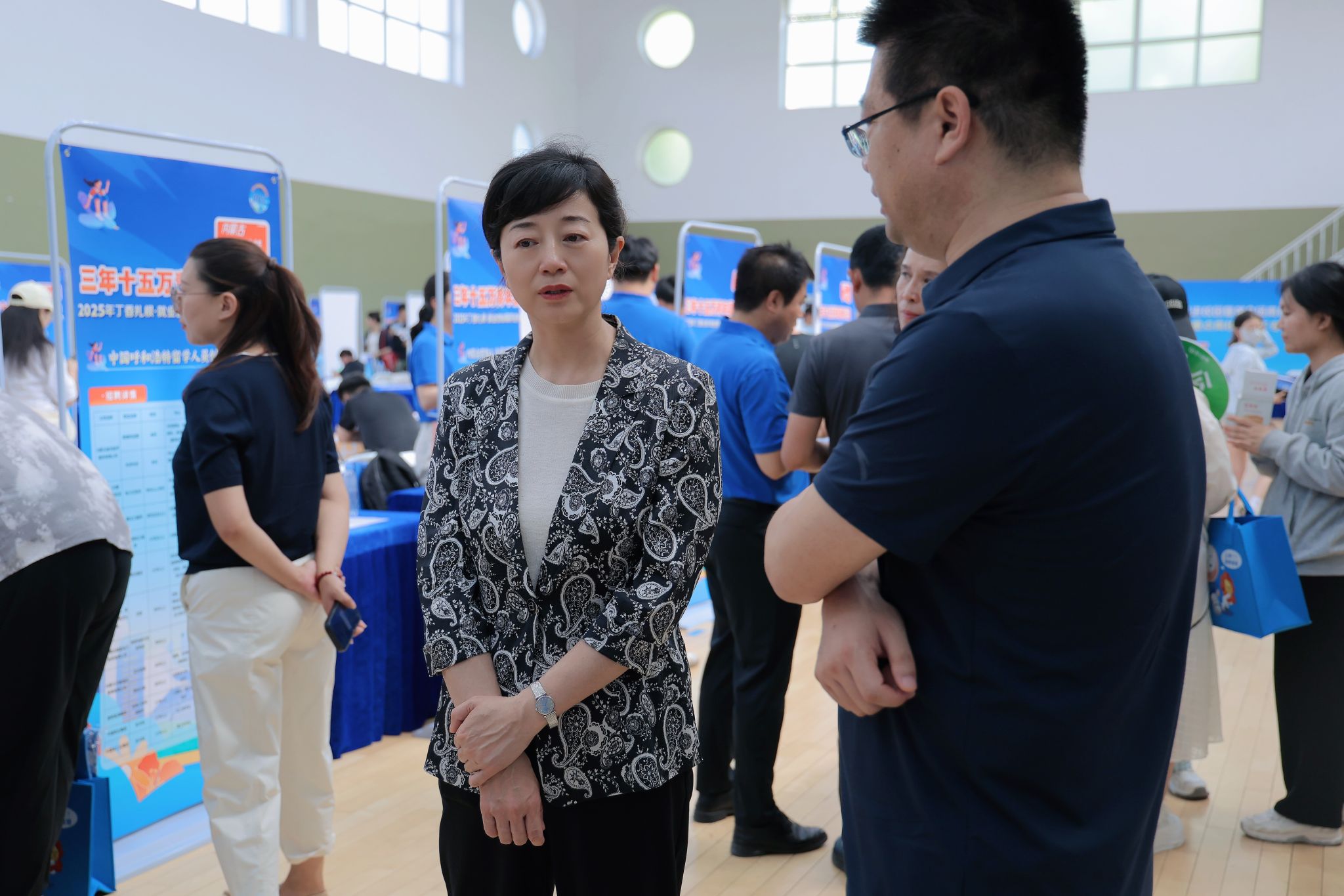 校党委副书记、校长王敏与呼和浩特市人社局副局长张鹏飞深入会场,了解用人需求。
