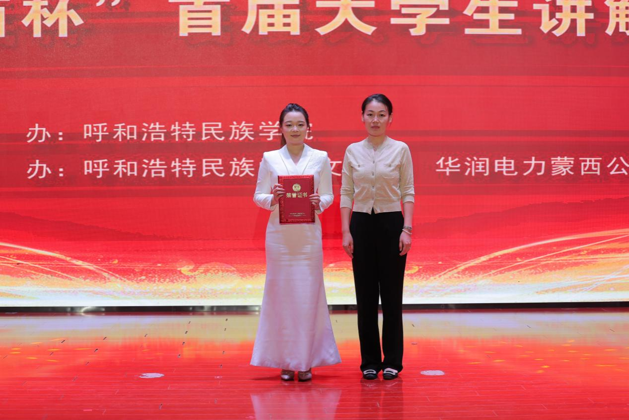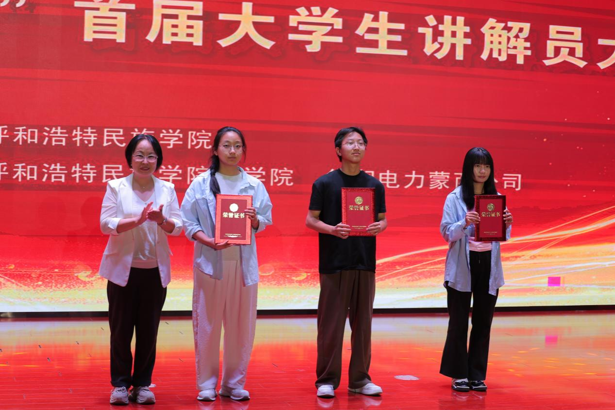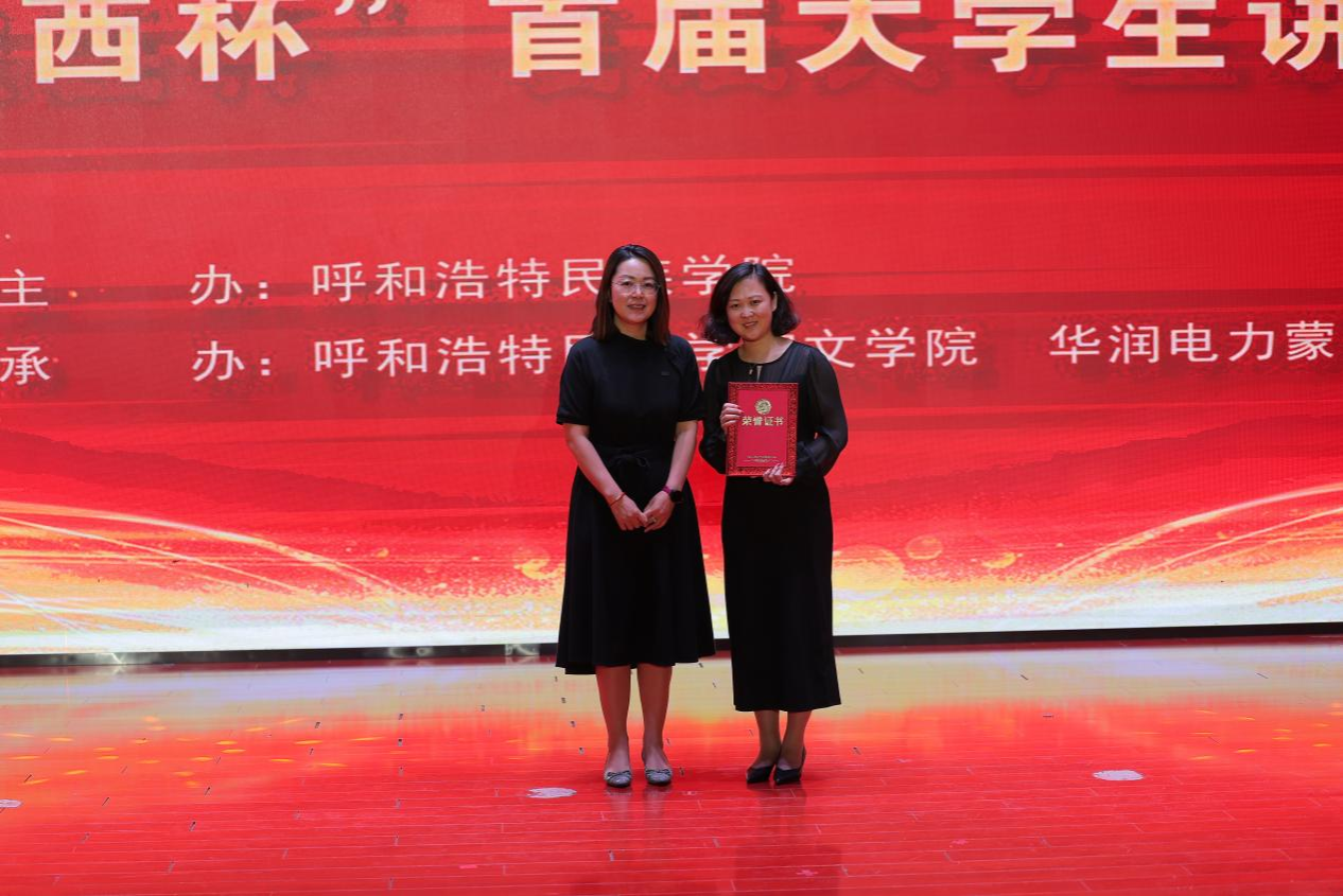 党委统战部部长朝格吉乐图宣读了《beat365英国官方网站党委统战部关于表彰“北疆小红马”大学生讲解团的决定》,现场嘉宾为“金牌讲解员”“突出贡献奖”“优秀讲解员”和“最佳潜力讲解员”颁发了荣誉证书,刘丽颖老师被授予“优秀指导教师”称号。
