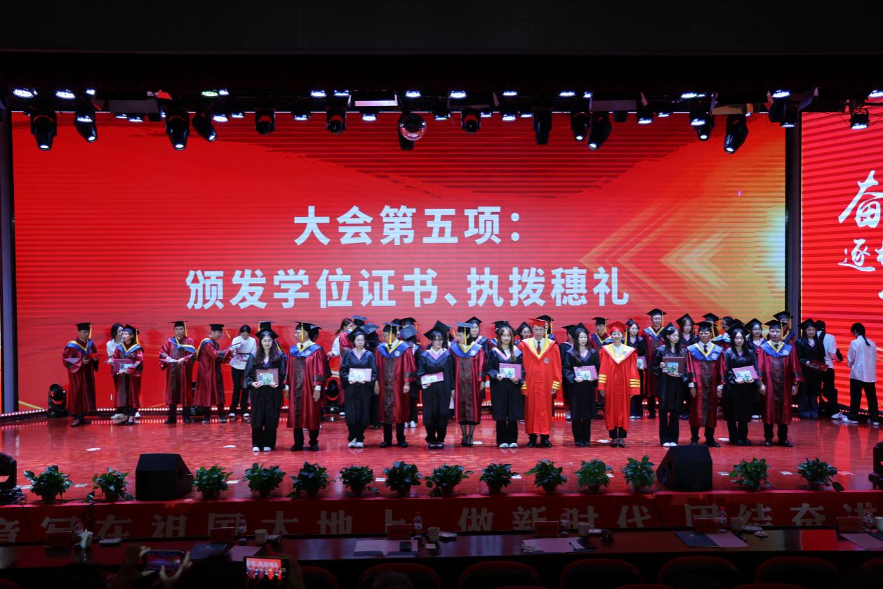 校领导、各学院院长为学士学位获得者颁发学位证书并拨穗。