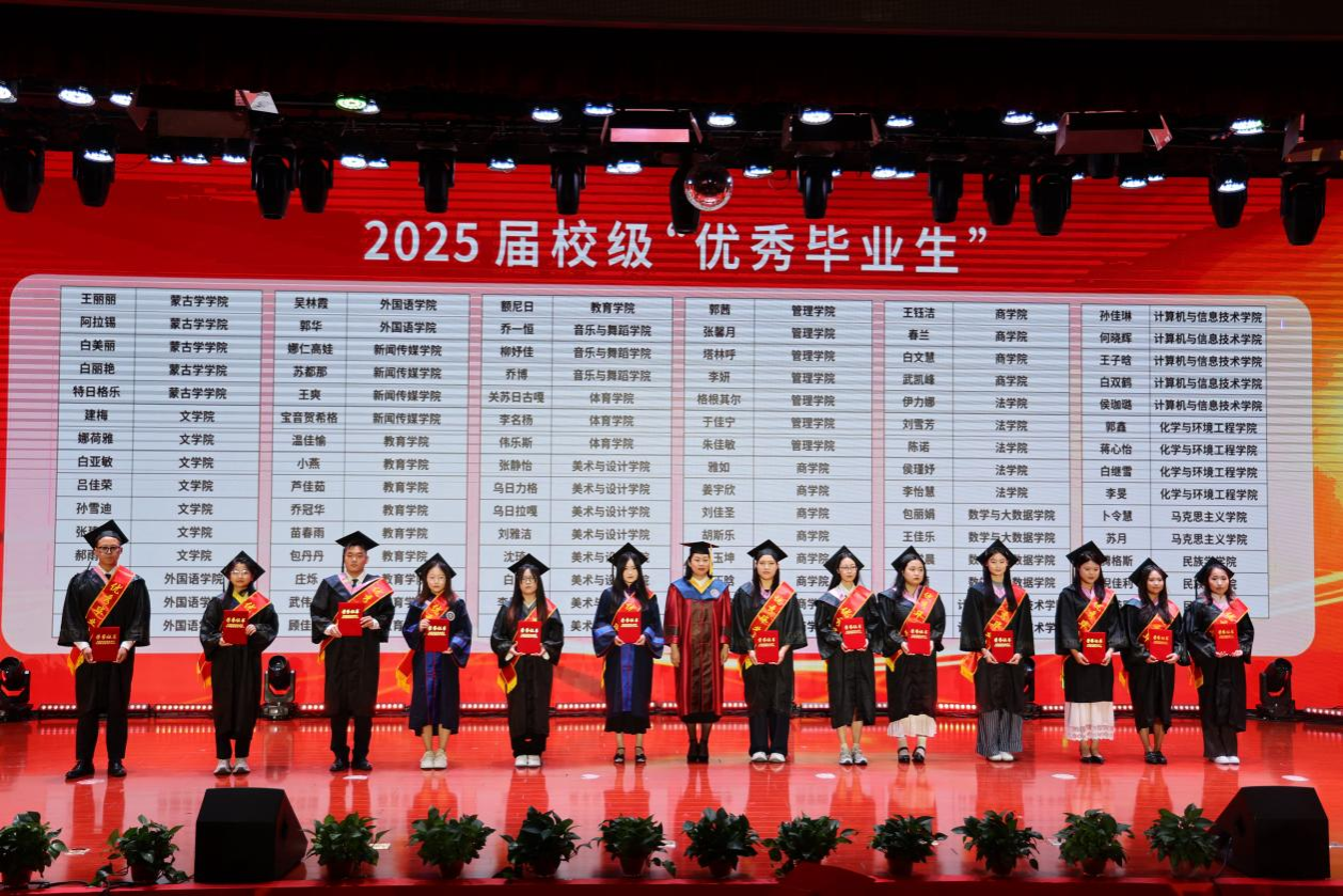 鸟语蝉鸣奏响夏日序曲,松柏掩映间阳光倾洒,6月27日,学校 2025 届毕业典礼暨学位授予仪式在师生的热烈掌声中正式启幕。身着学位服的毕业生们沐浴着晨曦,在松柏枝丫的光影交错中,迎接人生重要的里程碑时刻。校党委书记刘九万,党委副书记、校长王敏,党委副书记格根哈斯,党委委员、副校长高喜天、刘瑞鸿、额尔敦布和、双虎等校领导出席毕业典礼。各部门、各学院教师代表与600余名2025届本科毕业生代表来到铸牢中华民族共同体意识教育馆典礼现场,共同见证本科毕业这一人生中重要的时刻。毕业典礼由双虎主持。