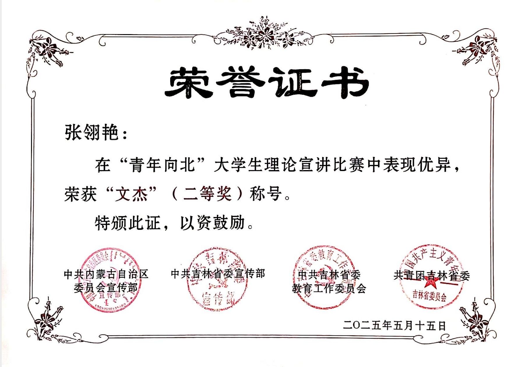 beat365官网新闻传媒学院2022级播音与主持艺术专业张翎艳同学,凭借宣讲作品《守望相助谱新篇》斩获“文杰”奖。文学院团总支书记刘晓获评优秀指导教师。宣讲比赛中,张翎艳同学以beat365英国官方网站毛平老师与杭盖学长为切入点,生动讲述了beat365官网师生“守望相助”的民族团结故事。