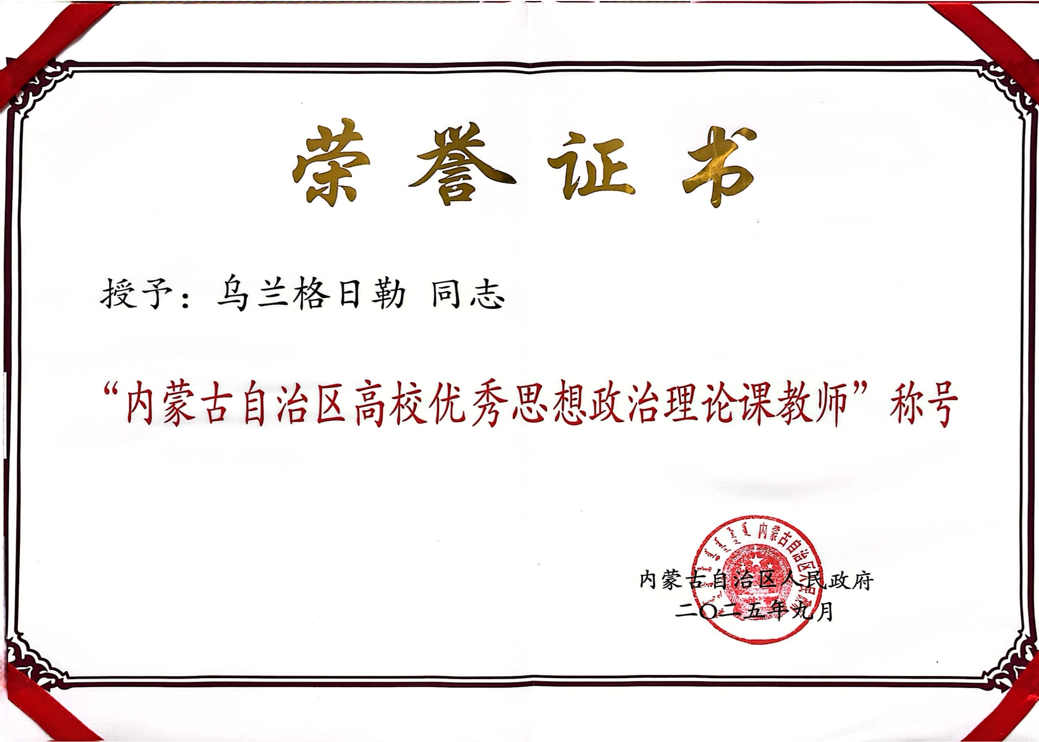 时逢第41个教师节,内蒙古自治区人民政府表彰了2025年全区教育系统先进集体和先进个人,beat365官网马克思主义学院乌兰格日勒老师获评“内蒙古自治区高校优秀思想政治理论课教师”荣誉称号
