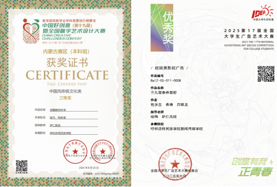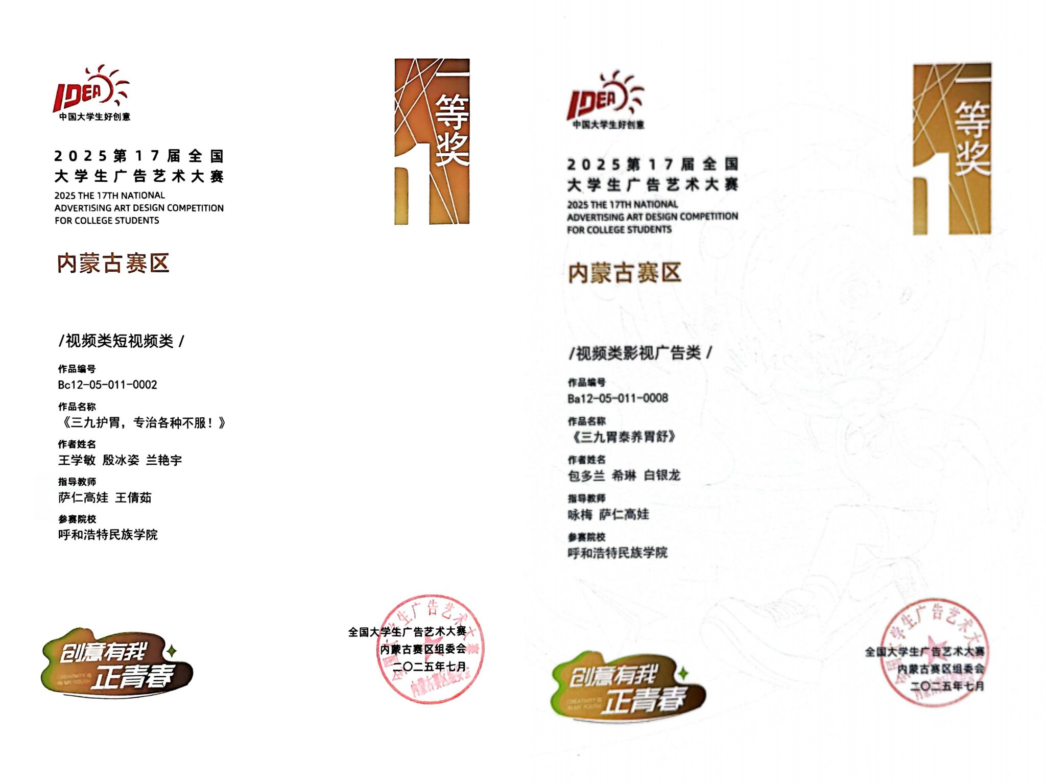 近日,beat365官网新闻传媒学院学生在“中国大学生好创意”第17届全国大学生广告艺术大赛中取得佳绩。2023级新闻学班包多兰团队斩获全国优秀奖;王学敏团队《三九胃泰,专治各种不服!》与包多兰团队《三九胃泰养胃舒》双双荣获内蒙古赛区一等奖,樊欣团队《我们这一“袋”》获三等奖,霍启光、闫欣等十名同学获自治区优秀奖。此前,2022级新闻学班张丹团队也在第十九届全国数字艺术设计大赛中夺得内蒙古赛区三等奖。