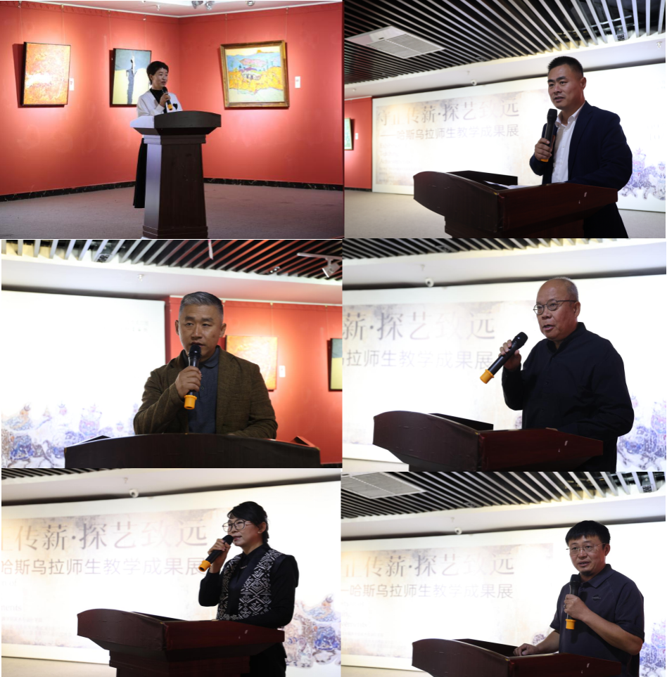 展览以“凝练教学实践”与“传承艺术文脉”为双核驱动力,呈现了一段关于艺术坚守、薪火传递与创新开拓的成长旅程,为区域美育事业发展注入新的活力。开幕式上,美术与设计学院院长高特木乐、内蒙古自治区美术家协会副主席于江、著名评论家,内蒙古艺术学院王鹏瑞教授、呼和浩特市美术馆副馆长郭剑利、现就职于土默特左旗第一小学的学生代表杭盖及哈斯乌拉老师本人先后致辞,共同分享了对美术教育与民族艺术传承的深度思考。