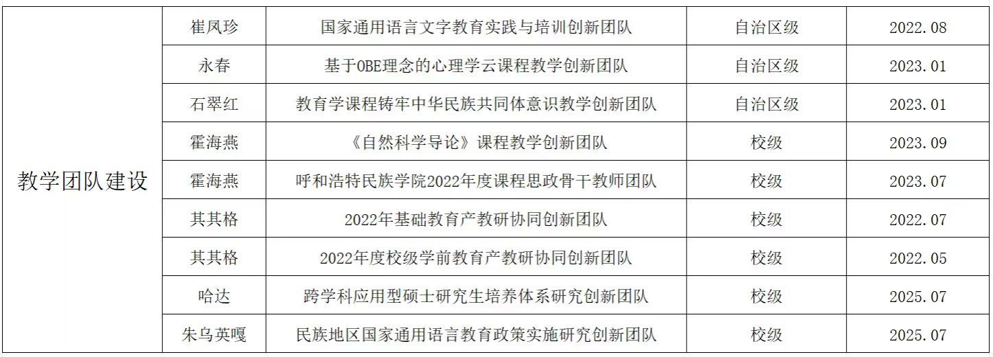 2019年教育学一级学科获批国家民委重点建设学科;2020年小学教育专业获批自治区级一流本科专业;2022年学前教育专业获批国家级一流本科专业建设点;2024年获批教育硕士点建设单位;2025年获批1门国家级一流课程和2门自治区一流课程;