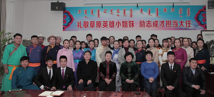 胡春梅副书记、阿拉坦仓副院长与草原英雄小姐妹及学生代表合影