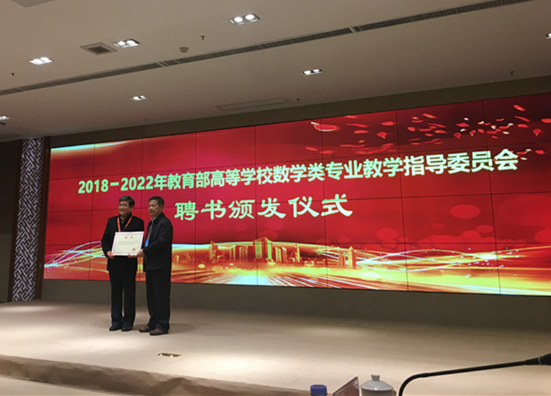 在本次会议上,首先由教育部委托教育部高等学校数学类专业教学指导委员会主任委员郑志明院士颁发教指委聘书,beat365官网阿拉坦仓教授再次当选新一届高等学校数学类专业教学指导委员会委员。2018-2022年教育部高等学校教学指导委员会涵盖了2个综合类、109个专业类和40个分教指委,集中了高等教育方面的权威专家,“教学能力强、学术造诣高”为基本的任职条件,是高等学校教育教学工作的最高专家组织。各教学指导委员会接受教育部委托,将开展高等学校教育教学研究、咨询、指导、评估和服务等工作。