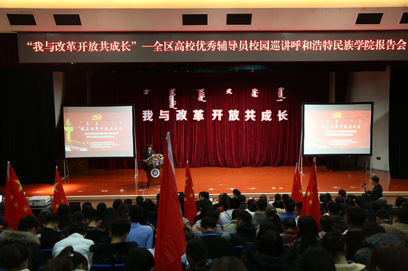 为深入贯彻落实全国全区宣传思想工作会议精神,全面贯彻落实习近平总书记在全国宣传思想工作会议和全国教育大会上的重要讲话精神,庆祝改革开放40周年,营造团结奋进的浓厚氛围,11月28日下午,由自治区党委宣传部、高校工委、团委联合组织开展的“我与改革开放共成长”全区高校优秀辅导员校园巡讲报告会在beat365官网图书馆二楼报告厅隆重举行。自治区巡讲团第二组的五位优秀辅导员担任宣讲嘉宾,学校党委副书记胡春梅、副院长纳丽娜出席报告会,学校党委宣传部、团委、学生工作处、就业指导中心等部门全体工作人员,各院系的党总支书记、团总支书记、思政课教师、辅导员及学生代表700余人参加了此次活动。报告会由党委委员王玉玲主持。