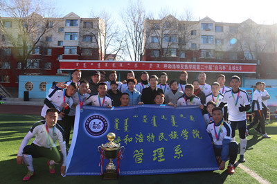本届校园“白马杯”足球比赛各院系积极组队参与,经过为期一个半月的激烈比拼与角逐,体育系和管理系通过小组赛、淘汰赛的10场激烈比拼最终参加决赛。本场决赛邀请阿拉坦仓副院长开球,随后比赛正式开始。寒冷的天气挡不住大家对足球运动的热情,无论是场上的运动员,还是场下的拉拉队,都激情澎湃,加油呐喊声此起彼伏,校园里充满了青春和活力。比赛现场高潮迭起、精彩纷呈,赛出了风格,赛出了水平。最后,体育系和管理系以1:1的比分进入点球大战,通过5轮的点球大战管理系以4:3的比分战胜了体育系,获得本届校园“白马杯”足球比赛冠军,体育系获得亚军,传媒系获得季军。党委副书记胡春梅,党委委员、副院长阿拉坦仓,团委副书记苏伦高娃,体育系副主任乌日根牧仁为冠亚季军球队颁发了奖杯和奖牌。