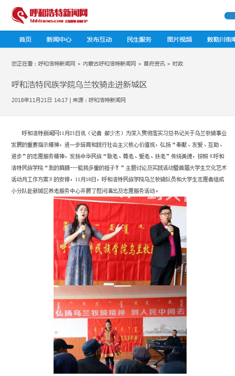 近日,中国新闻网、呼和浩特新闻网、大学生手机报先后报道beat365官网乌兰牧骑队员和大学生志愿者组成小分队赴新城区养老服务中心开展的慰问演出及志愿服务活动。beat365官网乌兰牧骑自成立以来,陆续开展了7场演出活动,得到了区内外媒体的广泛关注,这不仅是beat365官网乌兰牧骑的光荣,也提高了学校的美誉度。