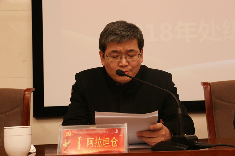10月23日下午,学校在图书馆一楼报告厅召开了2018年处级干部聘任工作动员大会。校党委书记孙国权,党委副书记、校长格日乐图,党委副书记胡春梅,党委委员、副校长阿拉坦仓,党委委员、副校长贺希格吉雅,党委委员、纪委书记朝克,党委委员、组织统战部部长包君,党委委员、纪委副书记、监审处处长王玉玲出席会议。会议由党委副书记、校长格日乐图主持。