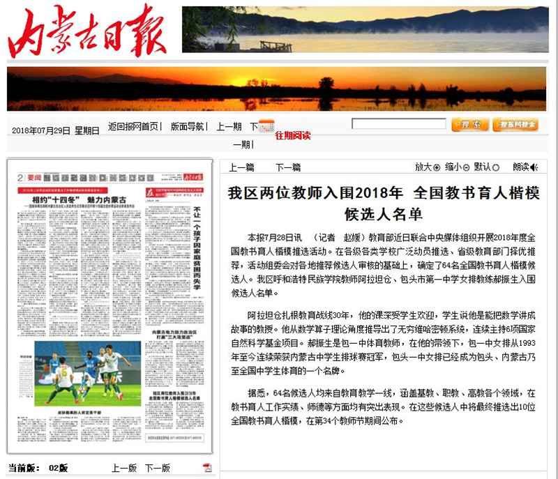 此次评选活动在中国教育新闻网广泛开展,《内蒙古日报》对我区入围的两名教师进行了宣传报道。据悉,此次评选最终将在64名候选人中推选出10位全国教书育人楷模,并在第34个教师节期间向社会公布。