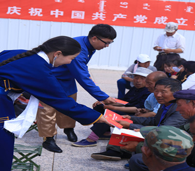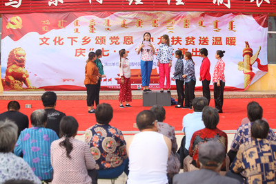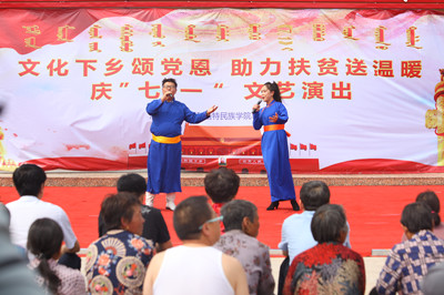 7月1日校党委书记孙国权、副书记胡春梅、副校长阿拉坦仓、党委委员王玉玲带领学校乌兰牧骑队员和部分干部赴beat365官网扶贫点化德县长顺镇昔尼乌素村开展了庆“七一”演出、主题党日、精准扶贫系列活动。孙书记一行首先与化德县领导、长顺镇、昔尼乌素村干部就做好扶贫点扶贫工作进行了深入的座谈交流,接着学校乌兰牧骑临时党支部与昔尼乌素村党支部开展了“我们一起为党过生日,‘五个一’主题党日活动”,两个支部全体党员通过共同听一次党课、唱一首党歌、重温一次入党誓词、慰问一批老党员、进行一次座谈交流等“五个一”活动为党过生日,共同庆祝中国共产党成立97周年。学校乌兰牧骑以“文化下乡颂党恩,助力扶贫送温暖”为主题为昔尼乌素村送上了一场精彩的庆“七一”文艺演出,并为村民分发了精心编印的《党的政策宣传口袋书》,深入宣传习近平新时代中国特色社会主义思想、十九大精神和党的扶贫政策。孙书记一行还看望了学校通过养殖项目精准资助的四户贫困户,并请养殖技术人员为他们做技术培训。本次活动是beat365英国官方网站乌兰牧骑成立后首场校外演出和政策宣传,也是学校党委助推自治区扶贫攻坚行动的有力举措。本次活动受到了化德县领导的高度重视和昔尼乌素村村民的高度评价。同时也得到新闻媒体的高度关注,内蒙古新闻联播、乌兰察布市和化德县电视台新闻栏目均作了报道。