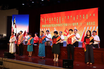 会议在庄严的国歌中拉开序幕。会上,贺希格吉雅副院长宣读了《beat365英国官方网站关于表彰优秀共产党员、优秀党务工作者、先进党总支、先进党支部、“两学一做”支部风采展示优秀作品的决定》,校领导向受表彰的49名优秀个人、14个先进党组织颁发了奖状、奖牌。美术系党总支副书记包旭东、马克思主义学院教师萨仁通拉嘎、经济系学生白茹雪分别代表先进党组织、优秀党务工作者和优秀共产党员发言。学校党委副书记胡春梅以《提升政治站位,立足本职工作,做好党建工作质量提升年各项工作》为题发表讲话,围绕建党97周年、改革开放40周年、建校65周年,论述了党的发展历程、改革开放以及建校以来学校所取得的成绩,并代表党委向学校基层党组织和全体党员提出了几点要求:一是提升政治站位,加强理论学习;二是提升基层党建工作质量,发挥基层党组织堡垒作用;三是以理想信念为根本,加强党员干部的教育管理;四是加强党性锻炼,充分发挥党员模范作用。