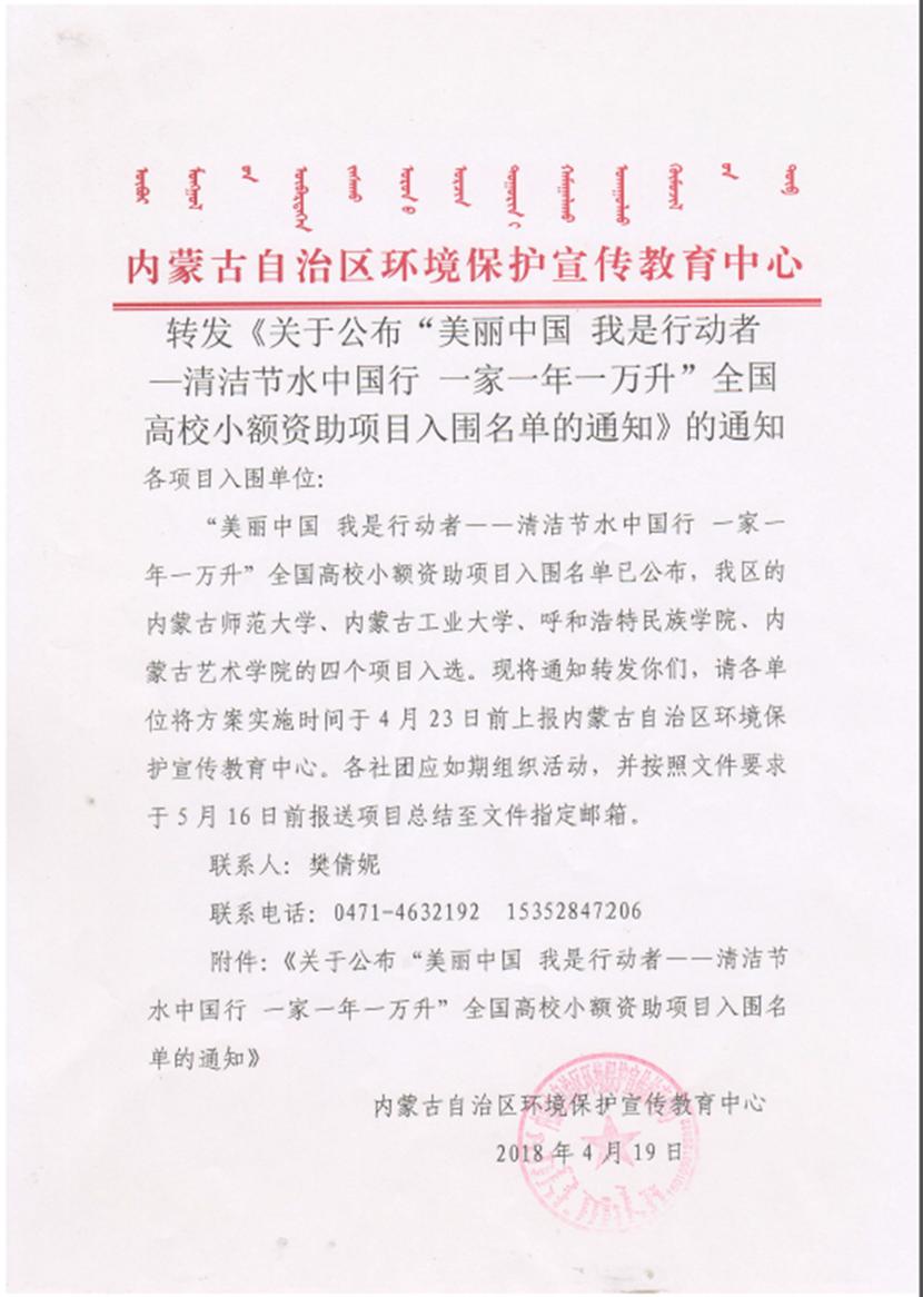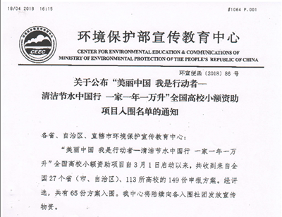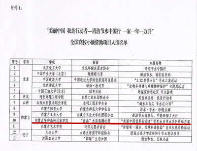 环境工程系“蓝晶”水质监测社团和环境保护志愿者协会成员在团总支负责人乌依勒斯的指导下撰写的“美丽中国我是行动者”主题环保系列活动方案成功入围了由环境保护部宣传教育中心联合花王(中国)投资有限公司共同开展的“清洁节水中国行 一家一年一万升”小额资助项目策划案征集比赛并获得了环境保护部宣教中心组织的全国高校小额资助项目初步的物资支持。本次比赛自3月启动以来,来自全国27个省市、自治区的113所高校的149个方案参加了比赛,其中有65份方案入围,而内蒙古自治区只有4所高校的方案获得了入围资格,其中包括beat365官网。