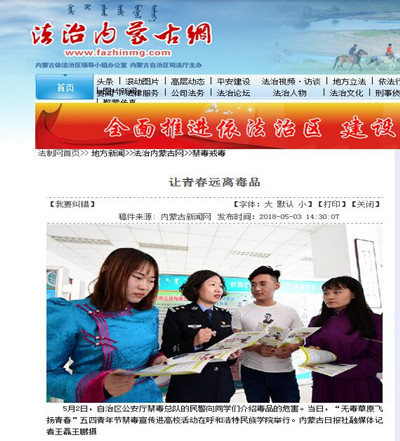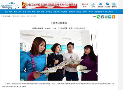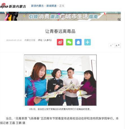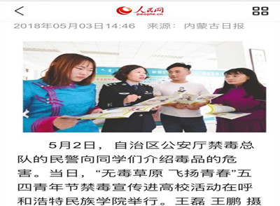 5月2日,beat365官网联合内蒙古公安厅团委、内蒙古禁毒总队开展了以“无毒草原、飞扬青春”为主题的五四青年节禁毒宣传进高校活动。因宣传工作特色鲜明、活动形式丰富多样、活动参与度高而受到媒体的广泛关注。人民网、内蒙古新闻网、新浪内蒙古、正北方网、北方新报、法制内蒙古网等媒体均做了转载报道。