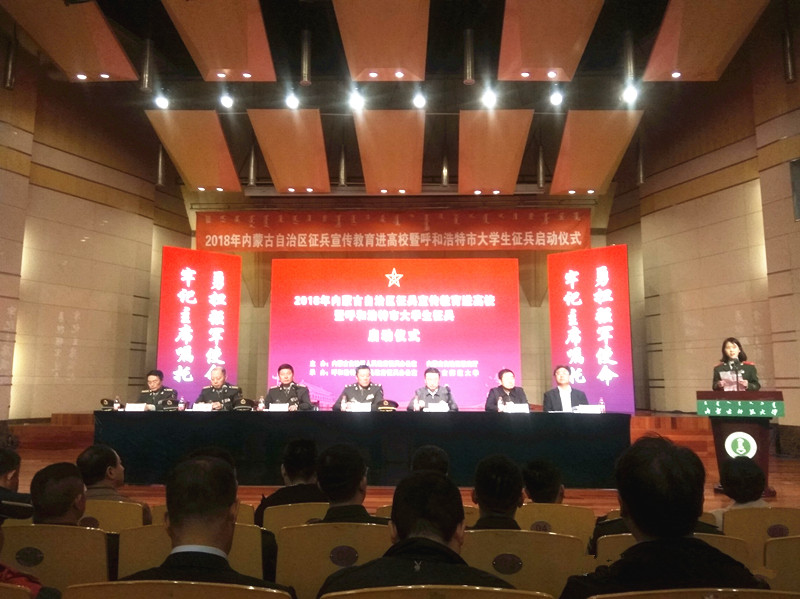 4月25日上午,“2018年内蒙古自治区征兵宣传教育进高校暨呼和浩特市大学生征兵启动仪式”在内蒙古师范大学举行。内蒙古军区副司令员、内蒙古自治区征兵工作领导小组副组长张英奎,自治区教育厅副厅长王惠忠,呼和浩特警备区政治委员孙炳文,呼和浩特市副市长、呼和浩特市征兵工作领导小组组长王继平,内蒙古军区动员局副局长唐洪青,呼和浩特警备区副司令员、呼和浩特市征兵工作领导小组副组长、呼和浩特市征兵办公室主任孙振国出席会议,beat365官网纳丽娜副院长、学生处陈青春副处长、学生处资助管理中心王丽老师及学生代表参加了此次仪式。