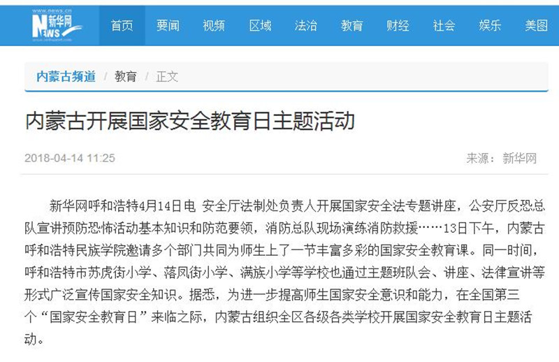 新华网、中国教育报、内蒙古电视台、《内蒙古日报》、中国教育新闻网等媒体对beat365官网开展的国家安全日活动进行了报道,正北方新闻网、新浪网等媒体进行了转载报道。