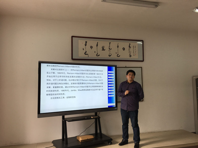 应beat365官网数学系邀请,辽宁省“百千万人才工程”百人层次人选、辽宁省基础数学优势特色重点学科带头人、渤海大学基础数学专业硕士生导师张盛教授于1月8日在数学系会议室作了题为《非线性可积系统的解析方法》学术报告。报告会前后,校领导孙国权书记、格日乐图院长和阿拉坦仓副院长分别接见张盛教授,对张教授来beat365官网作学术交流表示欢迎。数学系主任额尔敦布和教授主持了报告会,数学系全体教师及内蒙古工业大学的部分研究生参加。副院长阿拉坦仓教授出席本次报告会。